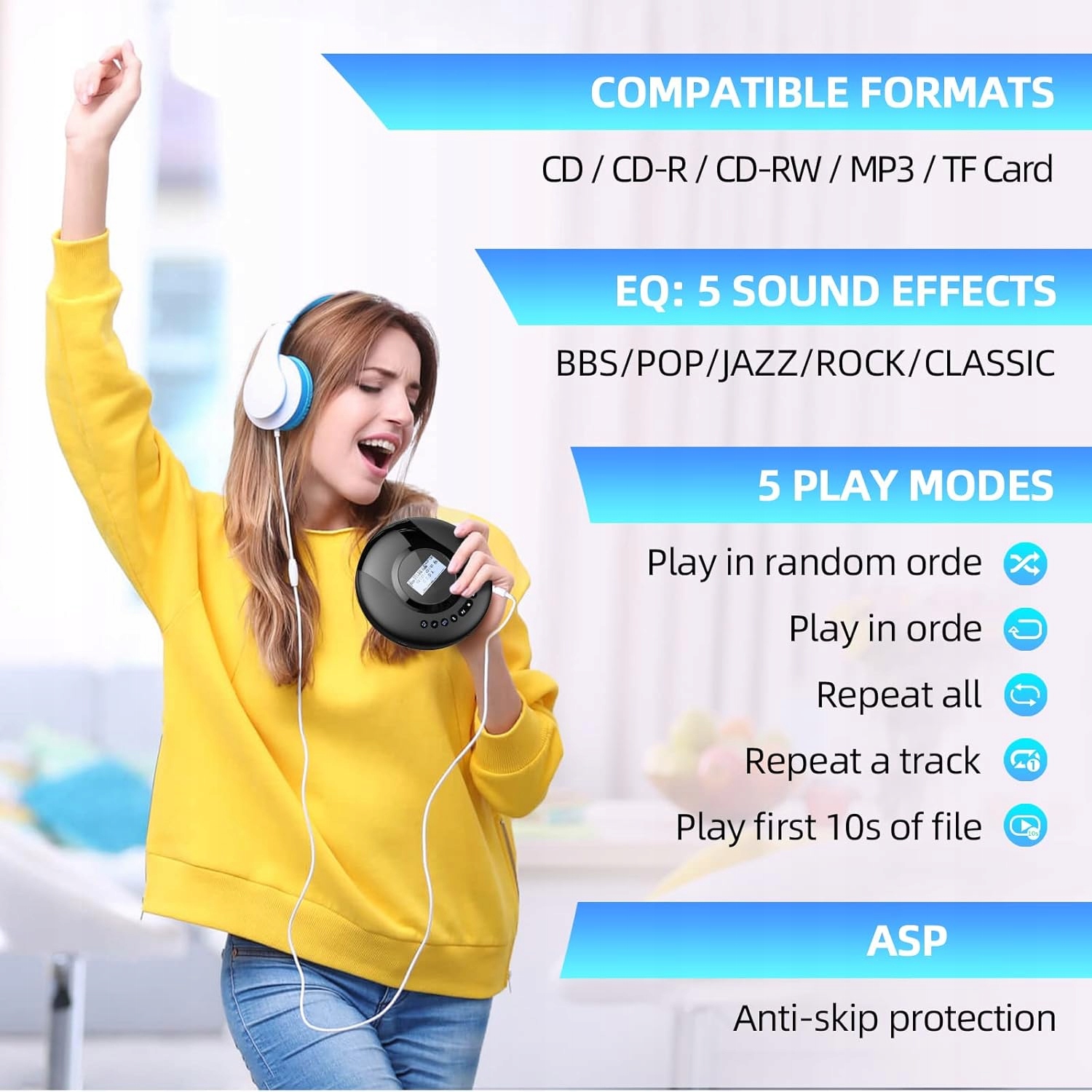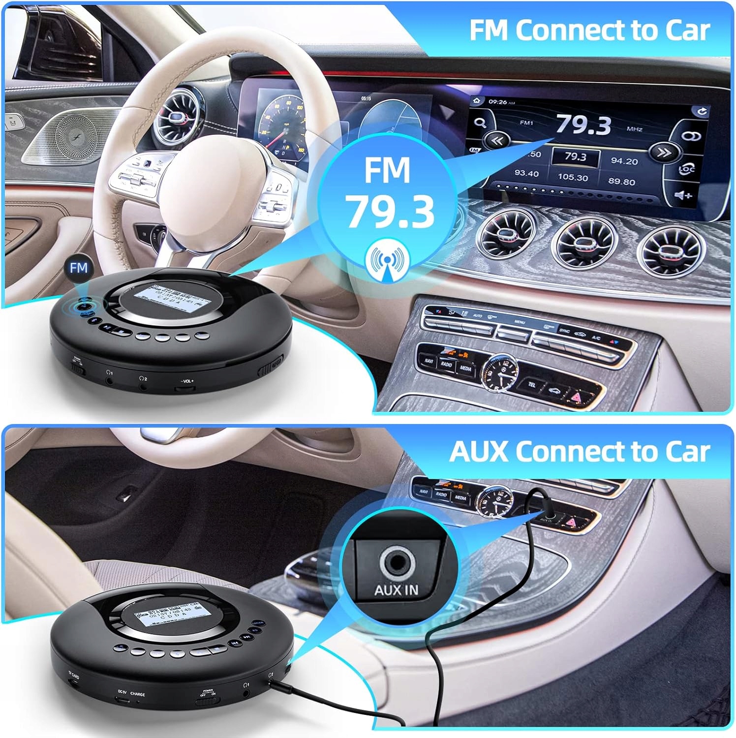 Вы можете легко сочетаться с наушниками, динамиками, радио, автомобилями и несколькими смартфонами. Кроме того, он может быть вымощен множеством FM -приемников одновременно. Поддерживаемые FM -каналы: FM 79,3 МГц/ 88,5 МГц/ 93,6 МГц/ 101,9 МГц/ 107,1 МГц. Оснащен улучшенной батареей с высокой мощностью. Он может играть до 19 часов (в ситуации: без использования функции Bluetooth). CD -игрок Walkman также доступен для автомобиля. У него есть вход AUX и кабель. Вы можете подключиться к динамике автомобиля с Aux. ПРИМЕЧАНИЕ. Перед включением, убедитесь, что переключатель «удерживать» находится в положении «ВыклКод продавца: R2/P3