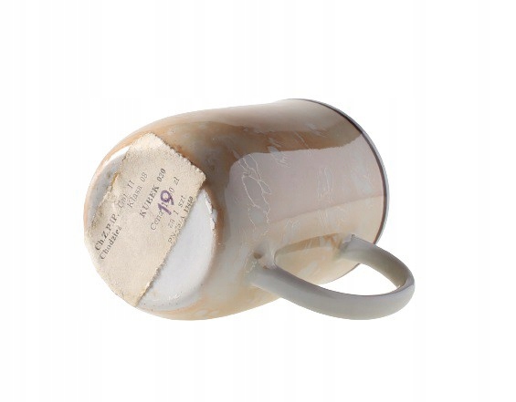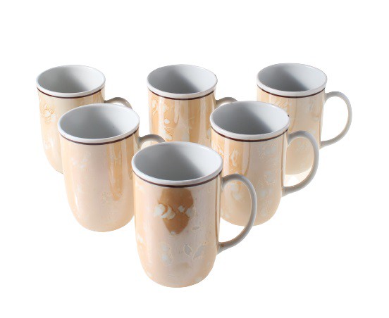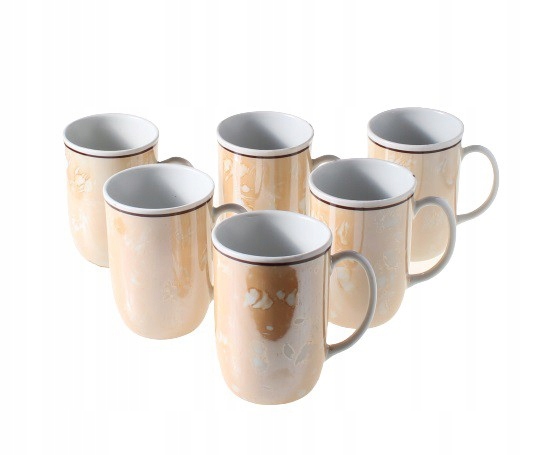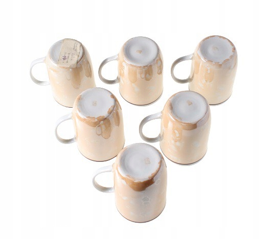 Шесть тонких кружек из глазурованного фарфора. Светло-коричневые чашки с коричневым ободком под крышкой заливной горловины. Чашки очень удобны в использовании – идеально подходят для чая или какао. Они происходят с Фарфоро-фарфорового завода в Ходзеже, Великопольское. 1970-е годы.