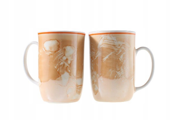 Шесть тонких кружек из глазурованного фарфора. Светло-коричневые чашки с оранжевым ободком под носиком. Чашки очень удобны в использовании – идеально подходят для чая или какао. Они происходят с Фарфоро-фарфорового завода в Ходзеже, Великопольское. 1970-е годы.