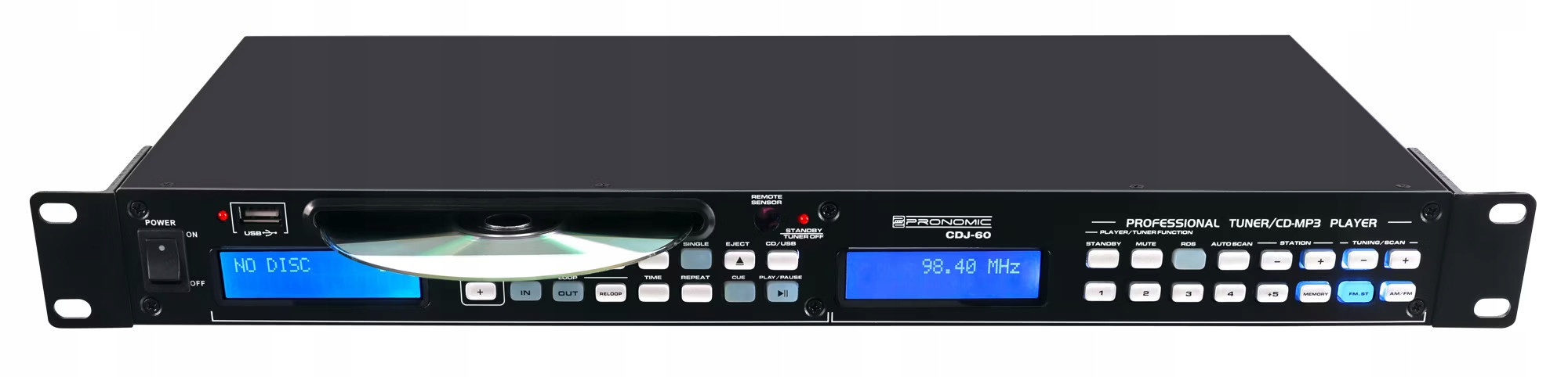 CDJ-60 имеет аудиоплеер для компакт-дисков и USB, а также радионнер в формате шириной 19 дюймов, совместимый с рамой. Оба устройства работают независимо друг от друга, а также имеют отдельные аудиовыходы. Тот факт, что основной переключатель питания находится спереди и, следовательно, легко доступен, он также очень дружелюбен