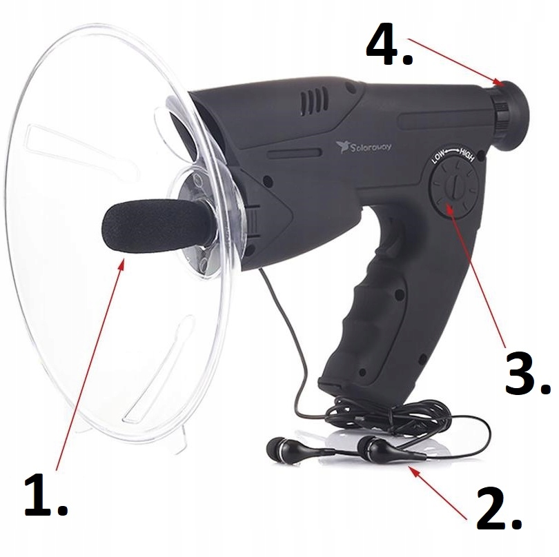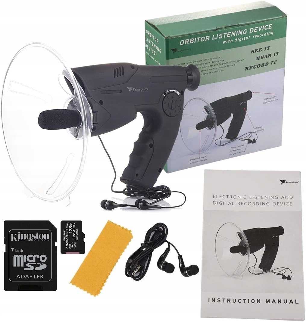 Параболическая антенна фокусировки звука обеспечивает превосходный прием звука, а встроенный объектив с 8-кратным зумом позволяет наблюдать, например, за слушающей птицей или человеком подслушал.