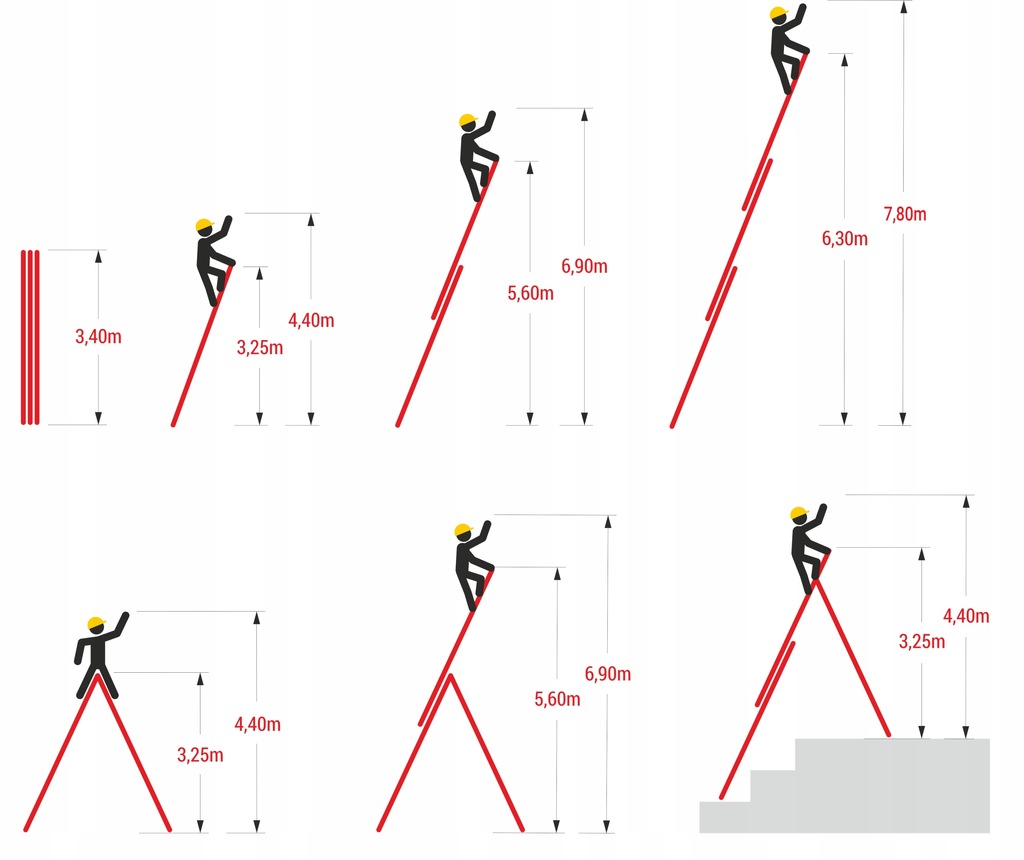 Самым большим преимуществом 3-элементных лестниц является их универсальность. Лестница HIGHER имеет целых 7 различных применений, что делает ее очень широкой и разнообразной. Примеры применения и технические параметры представлены на схеме ниже.