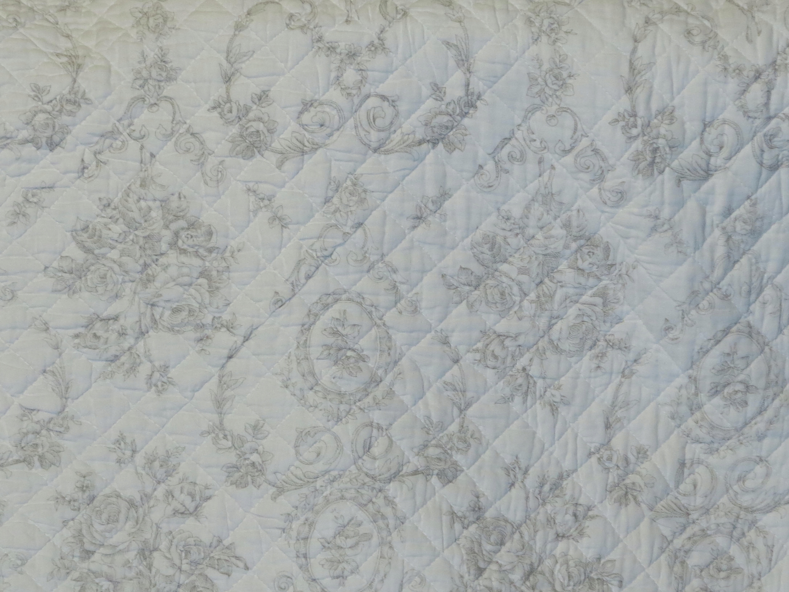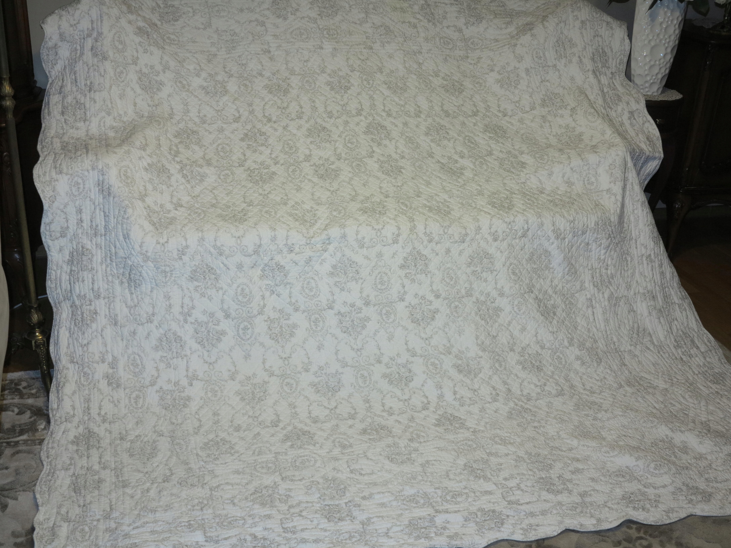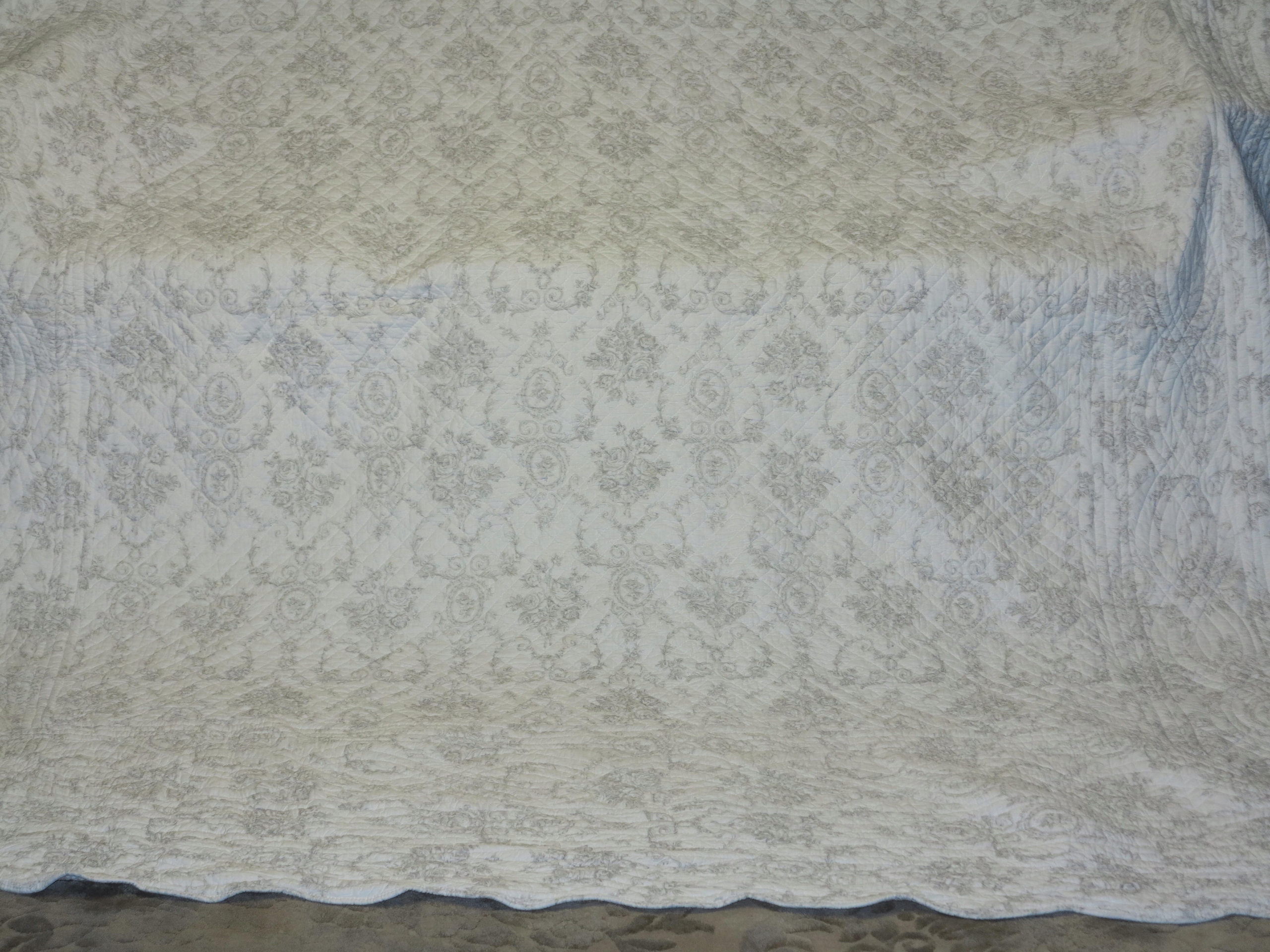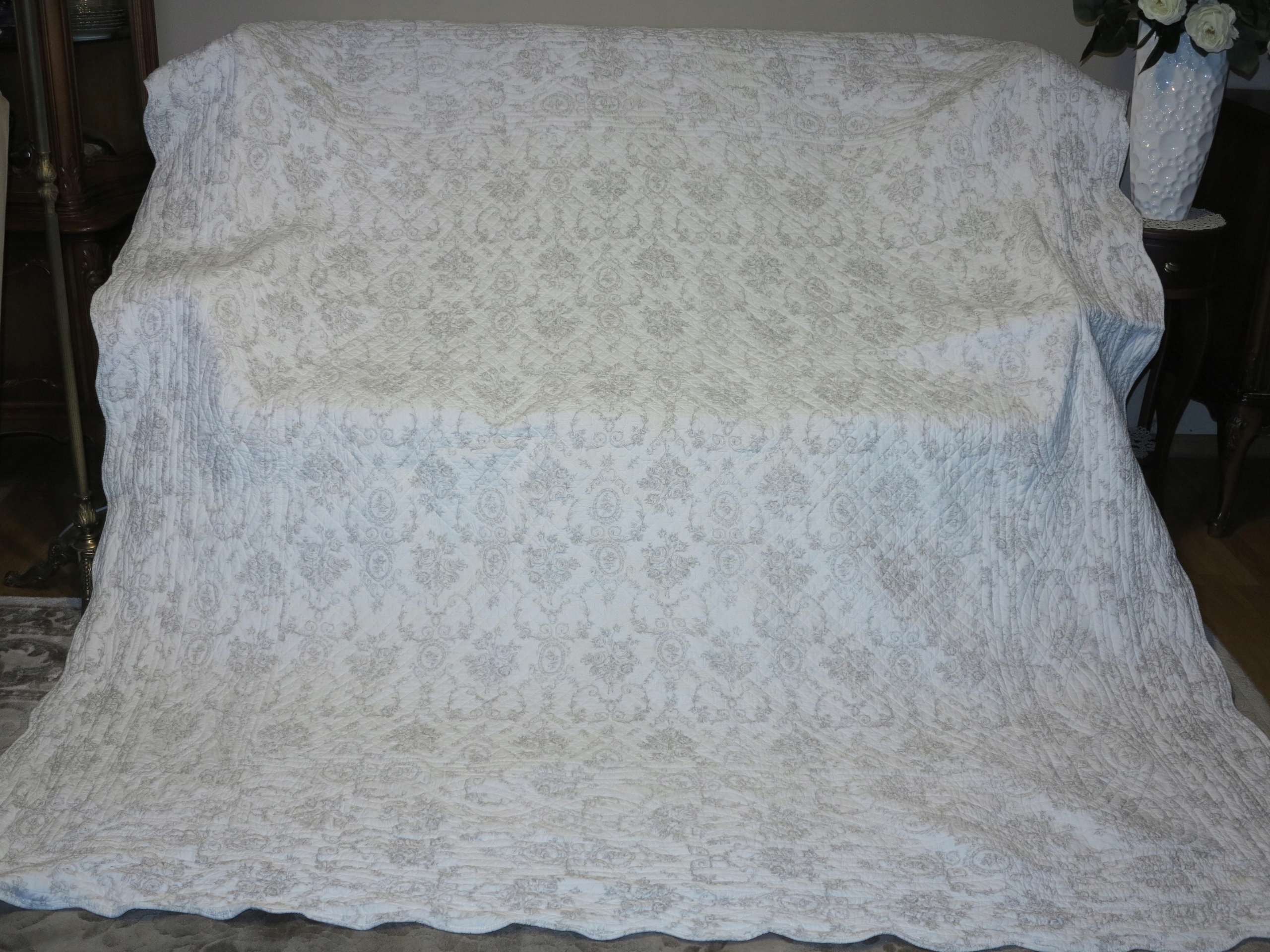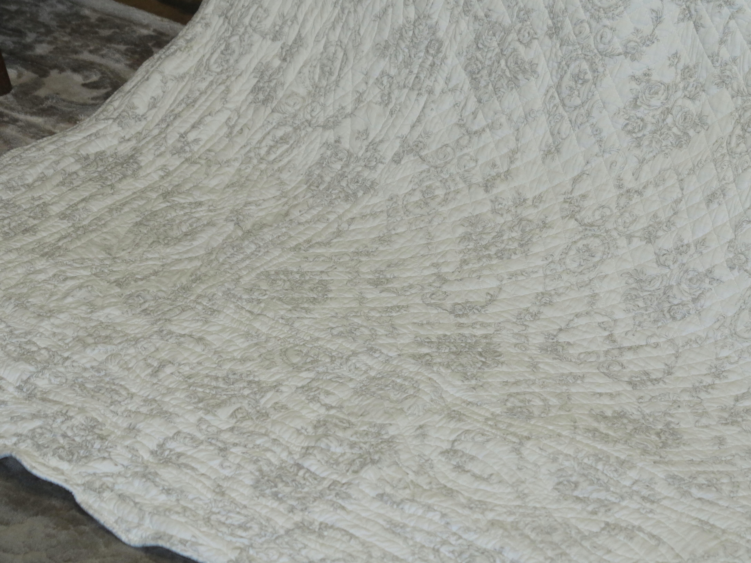 очаровательный, мелко стеганый покрывал с множеством розовых медальонов, вплетенных в стильный дизайн- стиль Провокал. Все края завершены с волной. Фон в кремовом белом. Паттерны Popielate