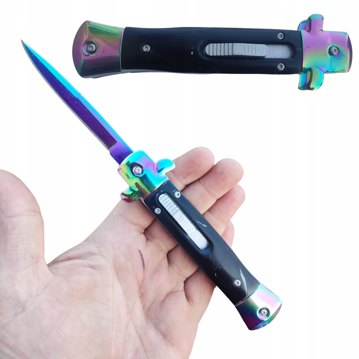Пружинный нож типа OTF (с выходящим вперед лезвием), который автоматически выдвигается и втягивается в рукоятке.