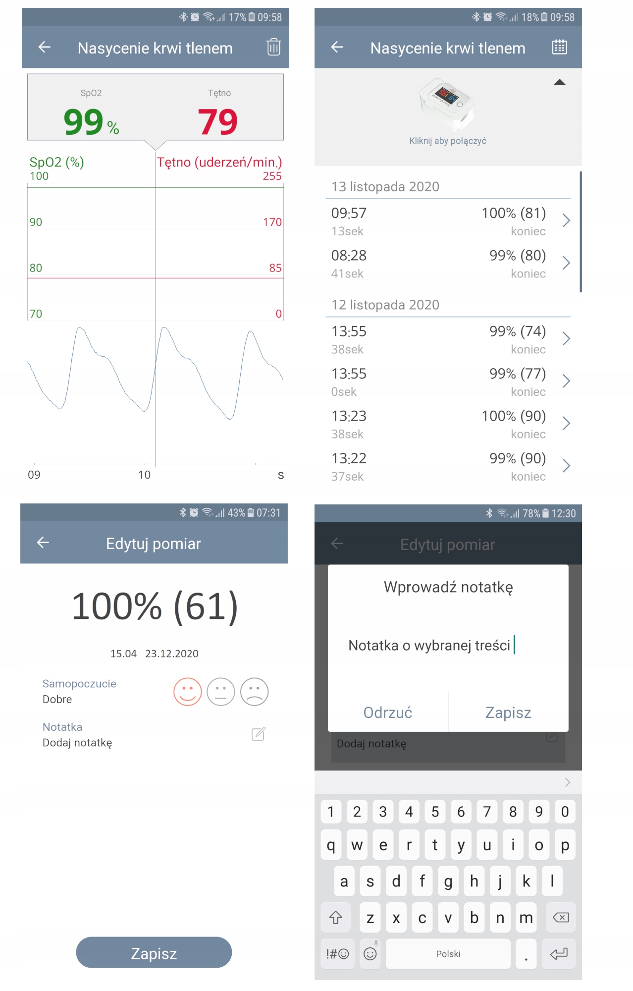 Каждый полученный результат можно подробно описать, используя стандартизированные параметры: самочувствие (отличное, хорошее, плохое). Вы также можете добавить примечание, например, о лекарствах, которые вы принимаете. Ваше описание будет навсегда закреплено за конкретной записью измерения.