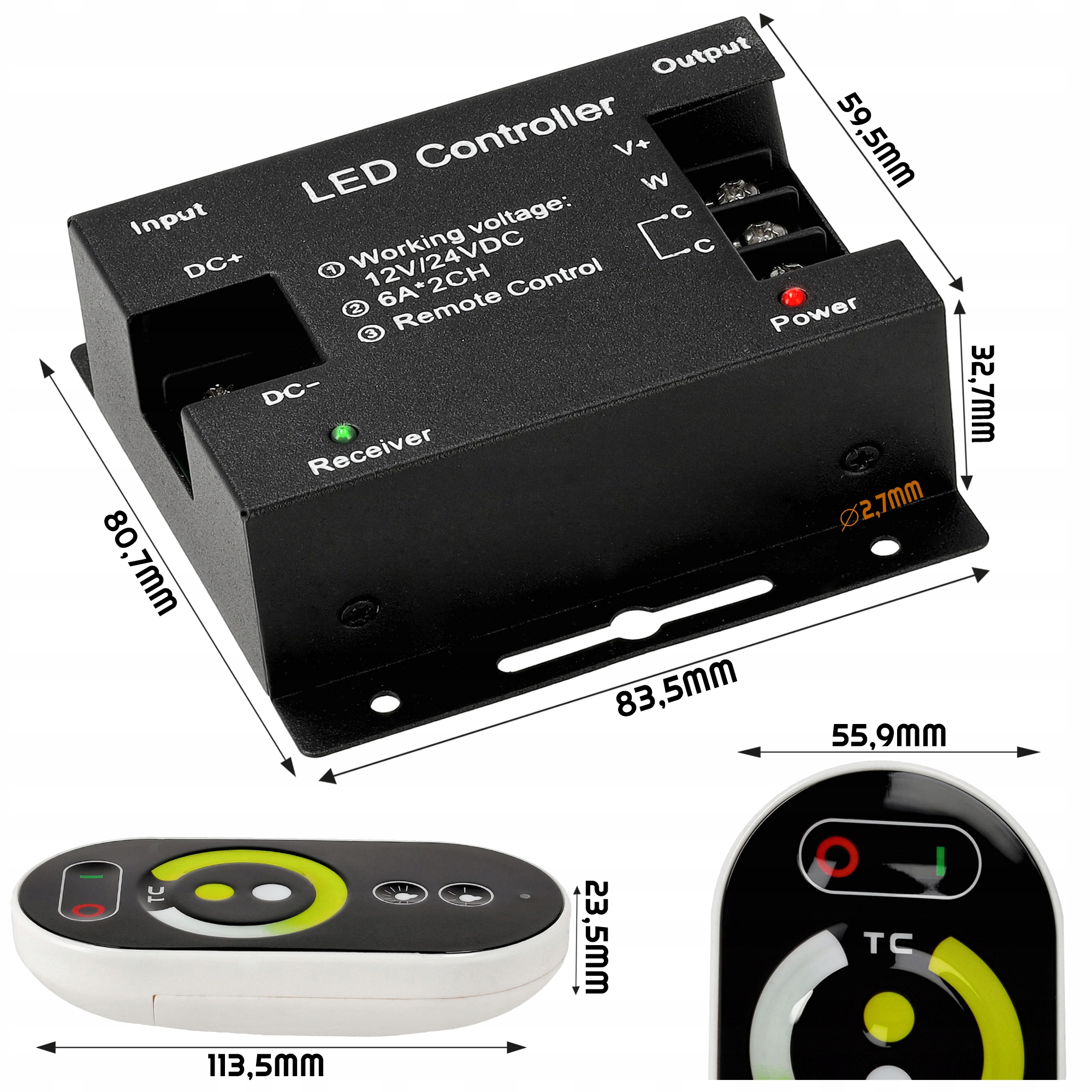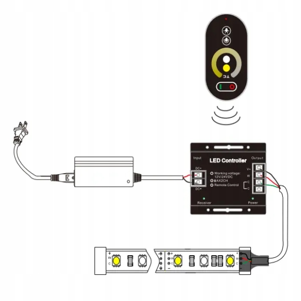 Принцип работы: Контроллер и пульт дистанционного управления работают на радиоволнах, дальность действия пульта дистанционного управления составляет до ~25 м, поэтому не нужно беспокоиться о связи пульта с контроллером (приемником), приемник можно спрятать под потолком, в шкафу, за панелями.
