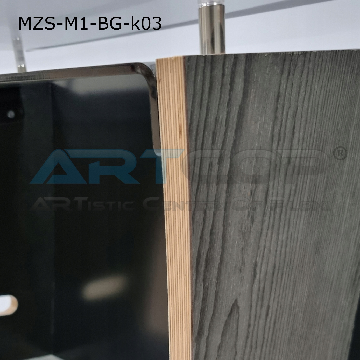 Материал: бесцветное оргстекло, верх – 10мм, основание и ножки из водостойкой фанеры толщиной 15мм, ламинированной HPL под дерево (коричневое дерево) снаружи и сплошной коричневый внутри, передняя панель из дибонда толщиной 3 мм (глянцевый черный или матовый цвет - на выбор).