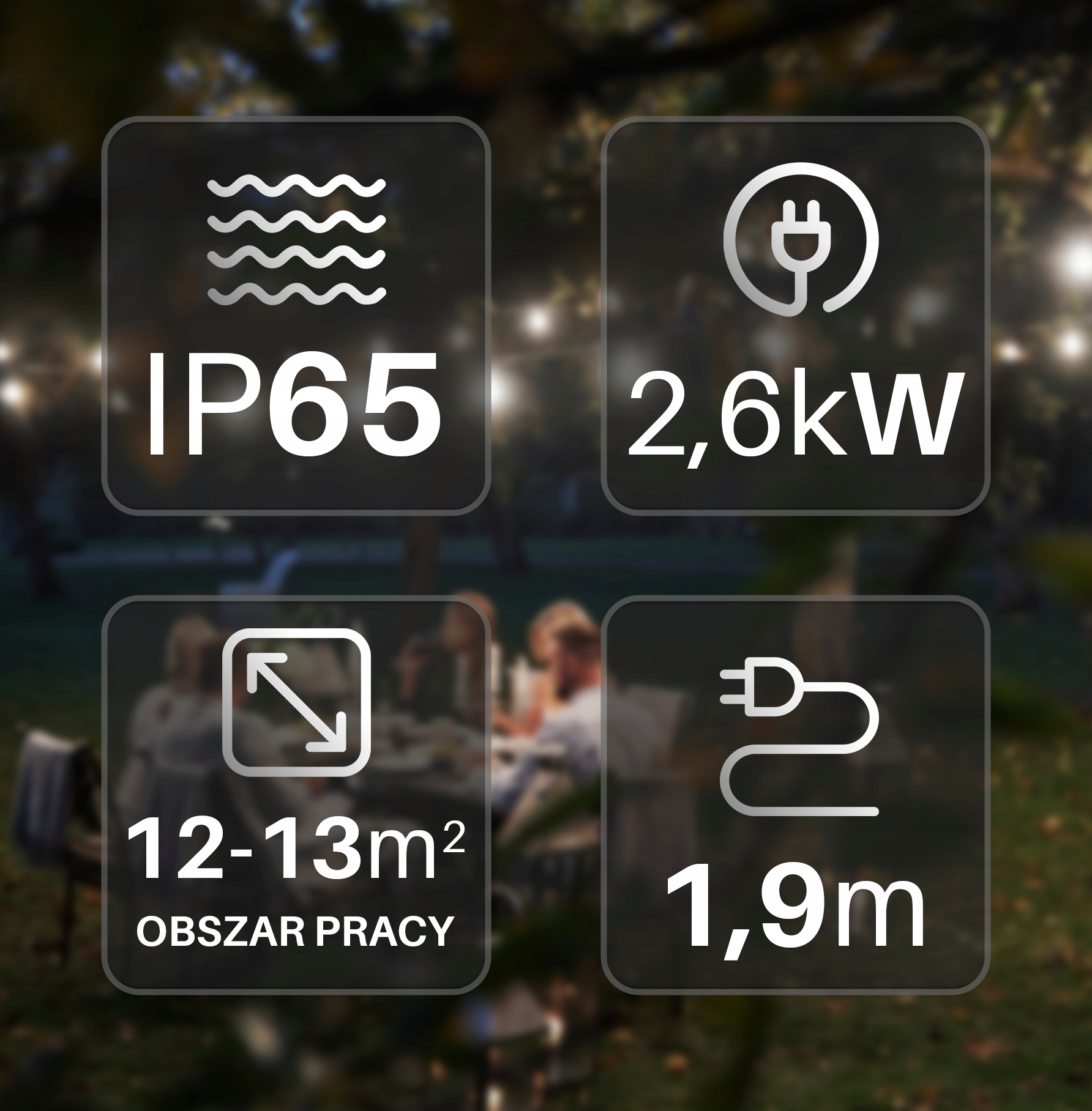 Радиатор Jowisz — это высший класс отопительный прибор, предназначенный для обогрева террас, балконов, беседок и других открытых и полуоткрытых поверхностей. Он использует уникальную технологию, которая излучает полудлинные инфракрасные волны. это очень безопасная, комфортная и ультра тихая система отопления, и все это в сочетании с высокой эффективностью, что что делает его единственным в своем роде продуктом на рынке. Мощность 2600 Вт гарантирует обогрев большой площади до 18 м2, при этом невероятно экономит энергию >. Управлять радиатором чрезвычайно удобно благодаря пульту дистанционного управления, позволяющему осуществлять дистанционное управление. Радиатор очень прост в установке. Благодаря тщательному изготовлению эта нагревательная панель надежна, тиха и устойчива к различным условиям. Благодаря используемой технологии он не выделяет неприятных запахов. Нагревательный элемент достигает высокой температуры, благодаря чему радиатор излучает очень приятное тепло.