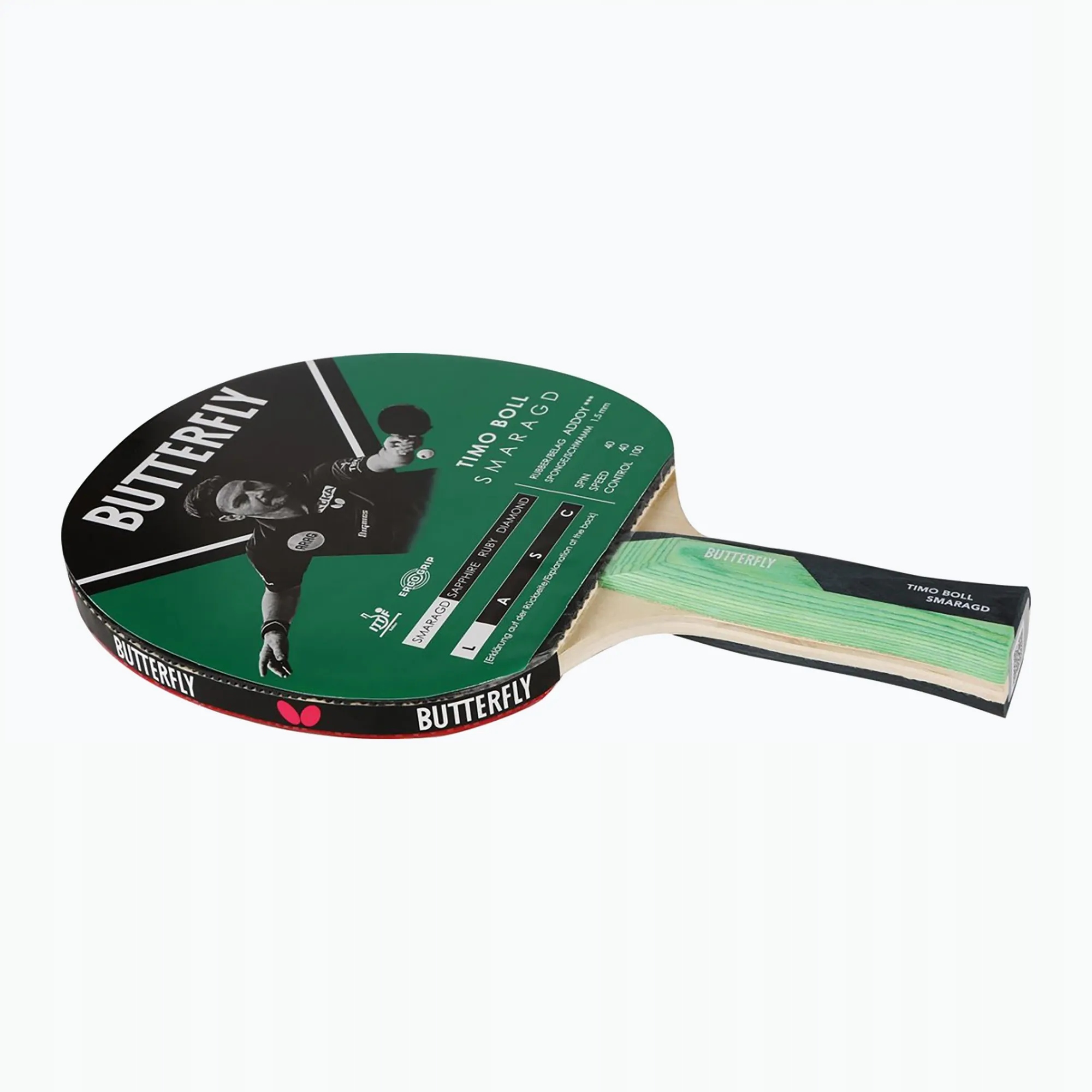 Butterfly Timo Boll Smaragd b>-ракета, предназначенная для первого клуба для игроков с растущими амбициями, которые хотят улучшить свою игру. Addoy Gum, одобренная ITTF с 1,5 мм губкой и технологией сцепления Ergo
