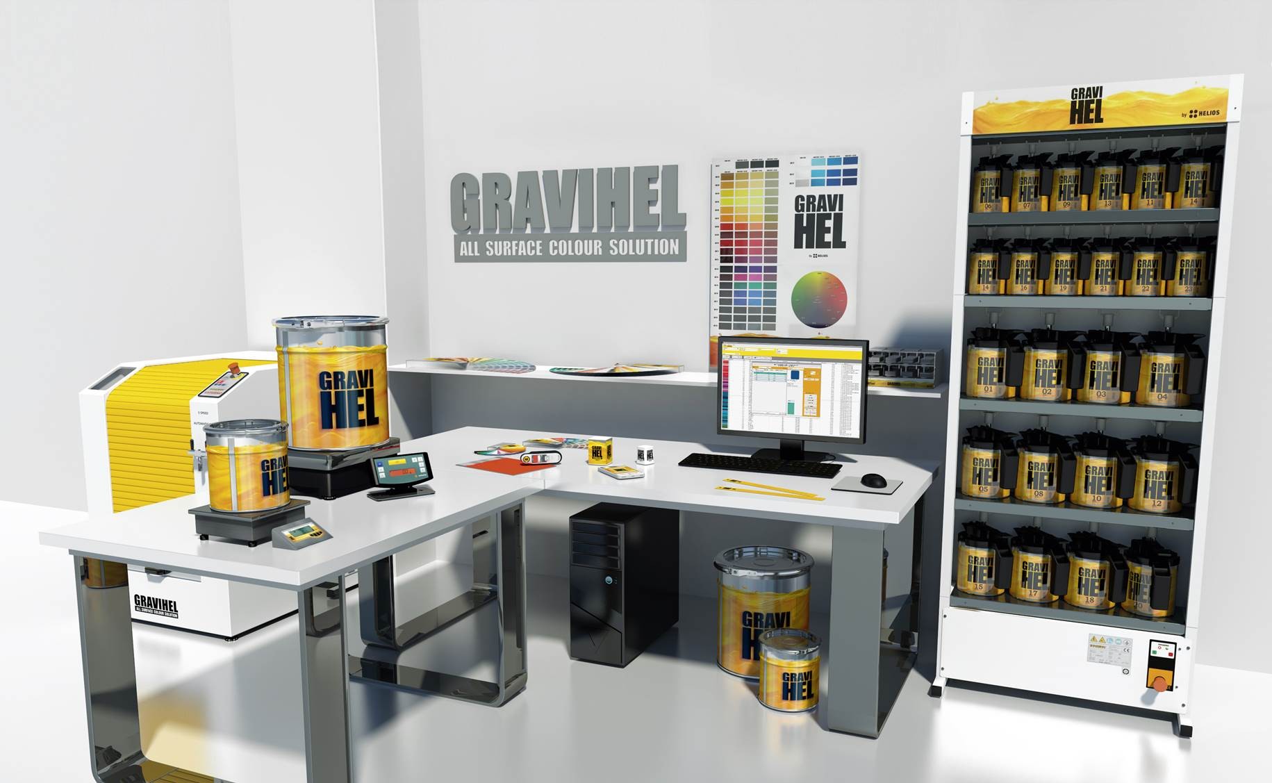 Gravihel - это профессиональная система привязки на смесях для тонкого мастерства, состоящего из 23 универсальных пасте (3 алюминия) и в настоящее время 15 различных связующих агентов. Система позволяет смешать более 8350 оттенков различных свойств (RAL, RAL Design, NCS, AFNN, британский стандарт и мобильный