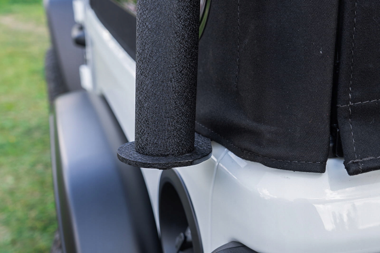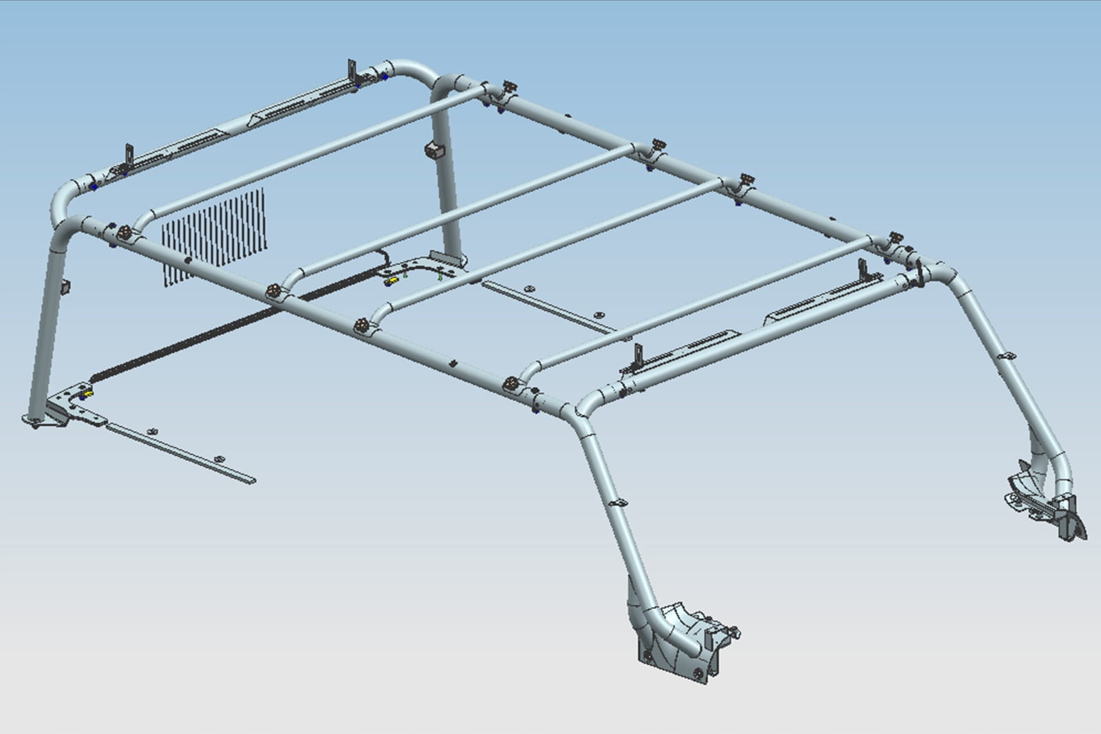 Диаметр труб — до 2 дюймов (5,04 см). Прочная конструкция позволяет загружать до 135 кг равномерно распределенного груза (300 фунтов). Модульная конструкция и съемные поперечины облегчают разборку Soft или HardTop. В комплект входят 4 поперечины, привинченные к рамной конструкции с помощью ручек. Поперечины можно свободно перемещать и демонтировать. Рама крепится в 4 точках: к креплениям передней двери и к задней раме.