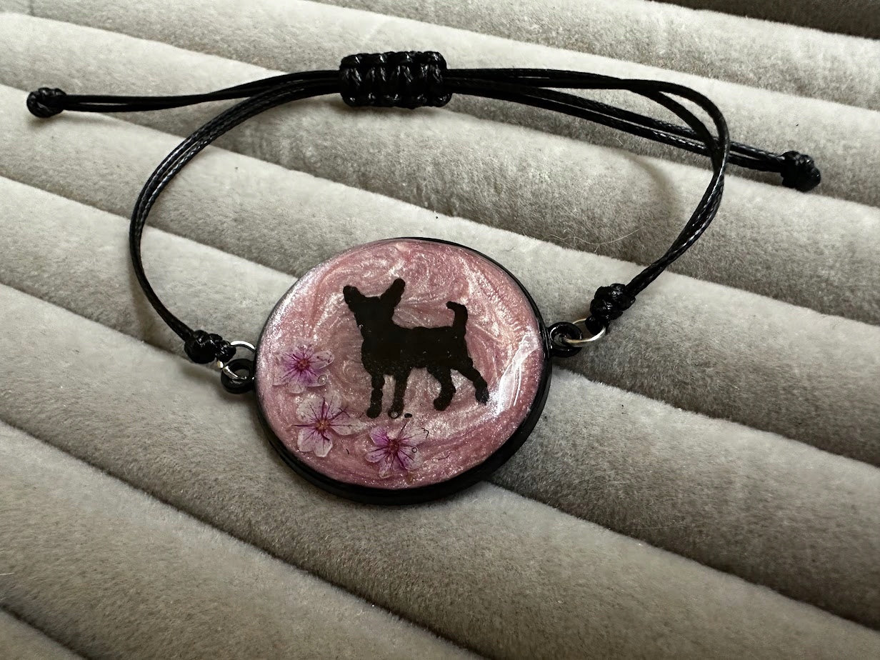 Ręcznie robiona bransoletka z żywicy – z prawdziwymi kwiatami i chihuahua
