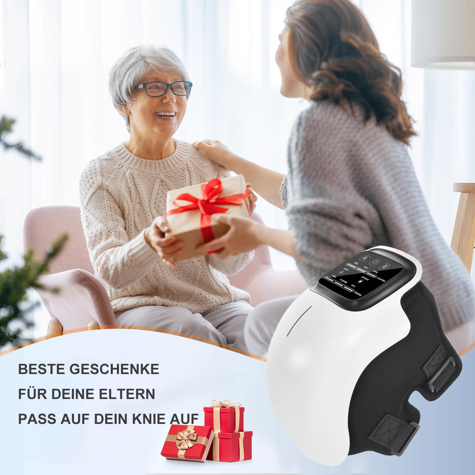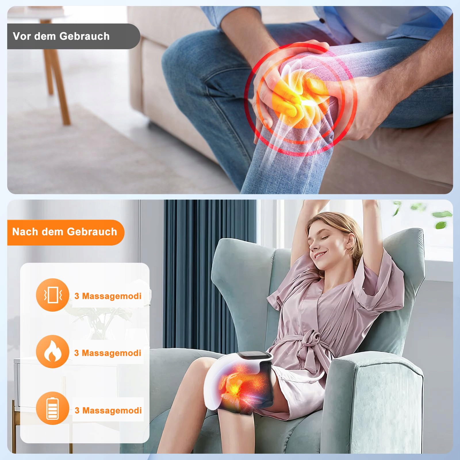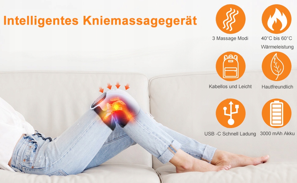 - Универсальный массажер для коленей, который снимает боль и дискомфорт и позволяет насладиться массажем после долгого дня. Этот массажер для коленей имеет 3 уровня вибрации: низкую, высокую и автоматическую программу. Три режима нагрева: низкий уровень 40 °C, средний уровень 50 °C и высокий уровень нагрева до 60 °C, все с дополнительным преимуществом переключаемого инфракрасного и лазерного освещения.