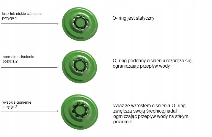 Регулятор расхода состоит из корпуса и динамического уплотнительного кольца. Уплотнительное кольцо реагирует на изменение давления и корректирует свою форму, закрывая или открывая поток через зазор. Это позволяет поддерживать поток практически постоянным.