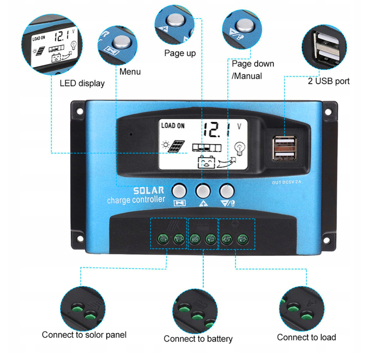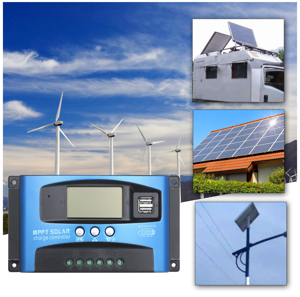 Солнечный регулятор и контроллер зарядки MPPT для фотоэлектрических панелей 12/24 В с ЖК-дисплеем и двумя портами USB .