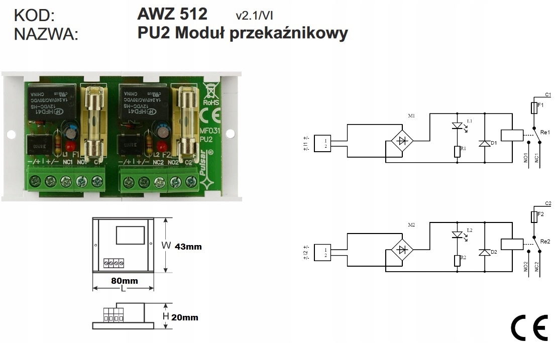 Релейный модуль AWZ 512 PU 2 от PULSAR предназначен для использования в низковольтных установках. Он используется для контроля и сигнализации состояний, например, в системах сигнализации и контроля доступа. Может использоваться для управления устройствами с высоким энергопотреблением через выходы OC систем сигнализации. Кроме того, обеспечивается гальваническая развязка сигналов и источников питания от выходов модуля.