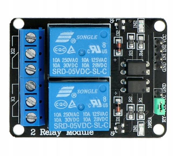 Модуль с двумя реле SRD-05 с катушкой с питанием 5 В и оптической развязкой входа, а также отверстиями для крепления. Система позволяет управлять исполнительными механизмами с помощью портов микроконтроллера или любого комплекта разработки.