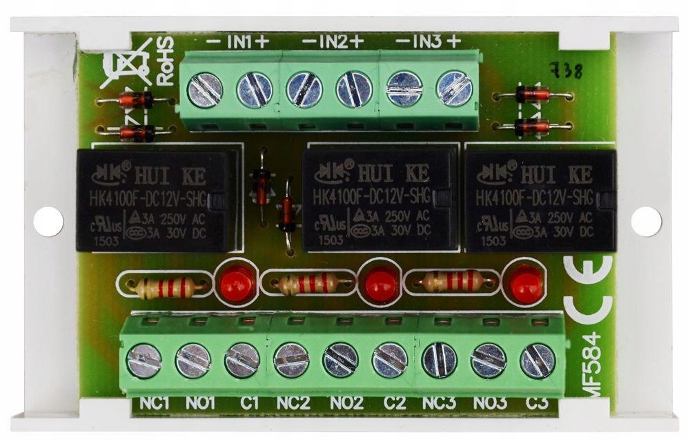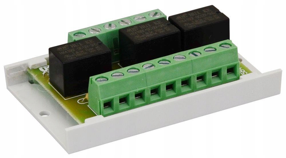 AWZ528 — это релейный модуль для использования в низковольтных установках. Он используется для контроля и сигнализации состояний, например, в системах сигнализации и контроля доступа. Может использоваться для управления устройствами с высоким энергопотреблением через выходы OC систем сигнализации. Кроме того, обеспечивается гальваническая развязка сигналов и источников питания от выходов модуля. Модуль предназначен для подключения проводов максимальным сечением 1 мм2. Модуль имеет пластиковую планку, снабженную клейкой лентой для крепления на ровной поверхности (стенка корпуса, буферный блок питания и т.п.) и отверстиями для опционального прикручивания планки к земле.