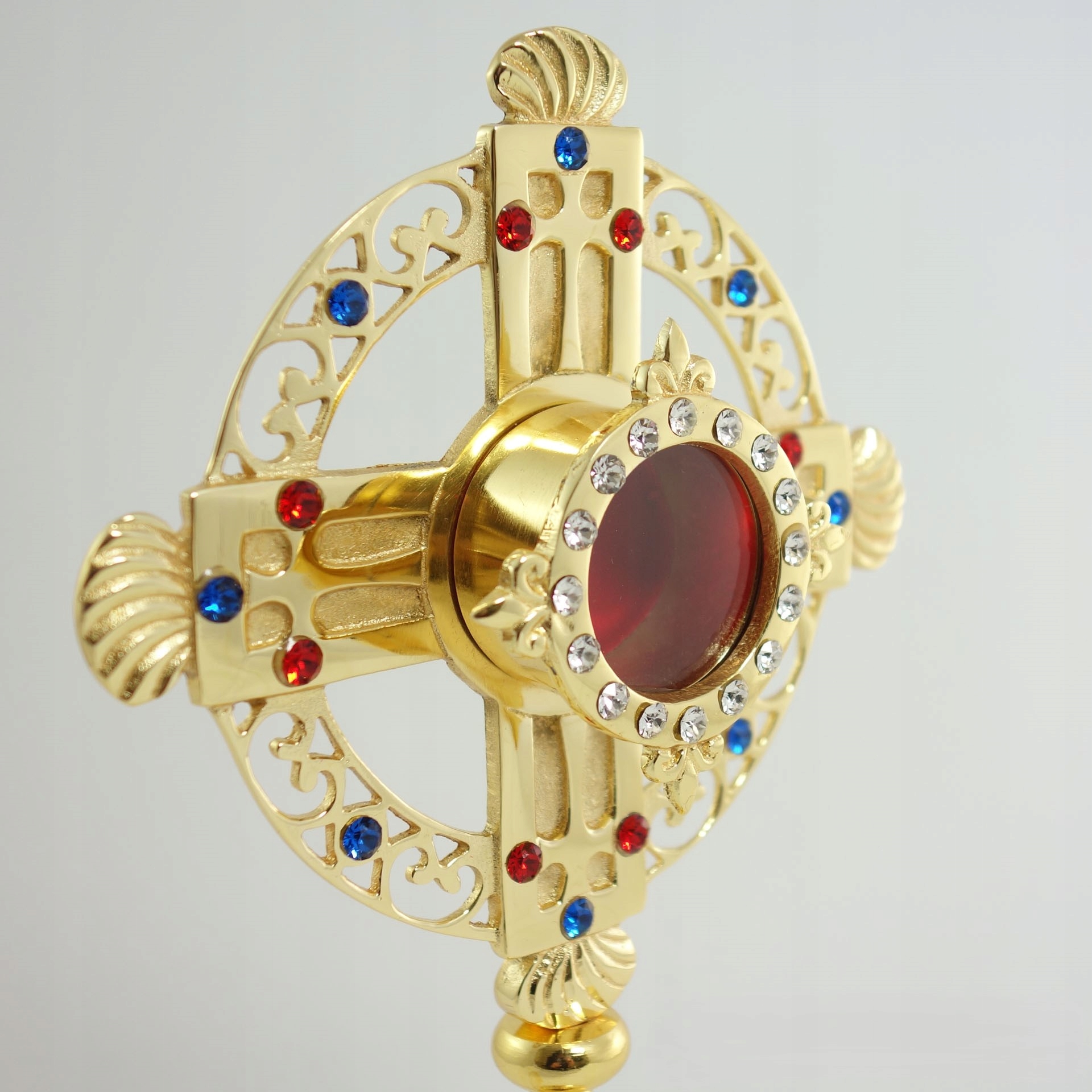 reliquary Gold -Plosted с помощью камней - 26 см. Основной частью является декоративный крест, надписанный в декоративном щите, руки которых украшены многоэтажными камнями - красными, синими и прозрачными. В целом увенчано тонким ореолом с открытым работой, что добавляет легкость и уникальный характер.
