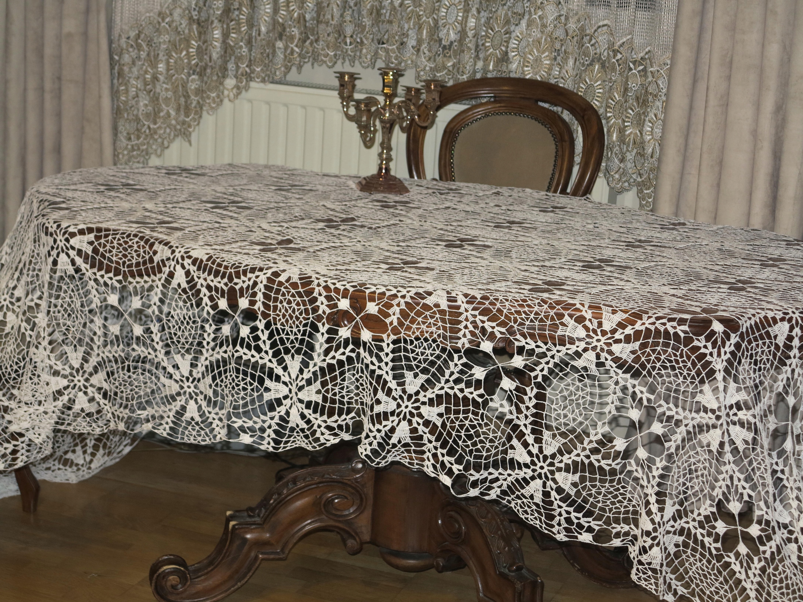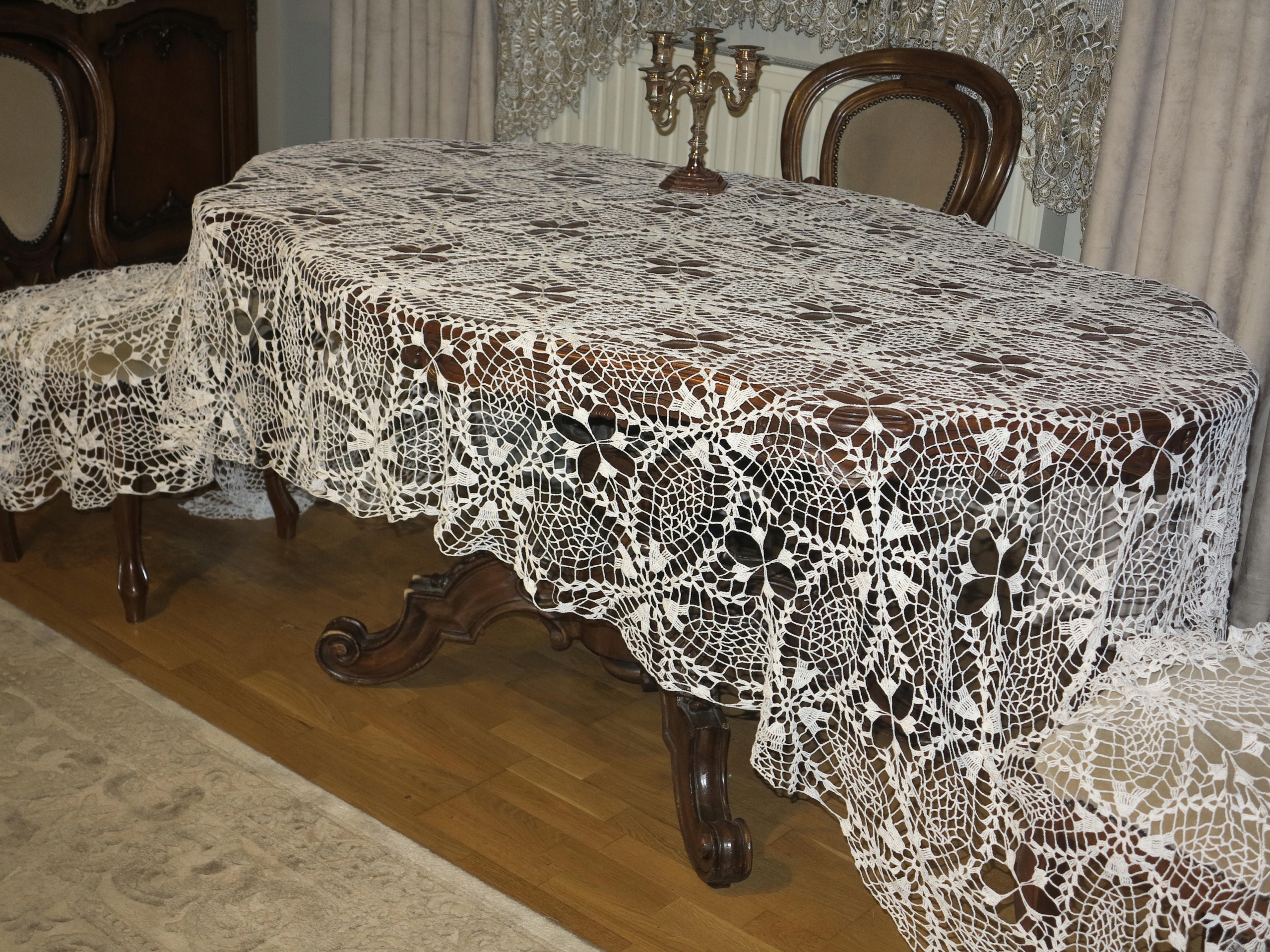 чрезвычайно красивую, огромную скатерть, кордон -скатерть Bielsieńki, полностью ручная из хлопковых нитей на тонком вязании крючком, в очень декоративном рисунке. Эта скатерть потребовалась много работы и времени производительности