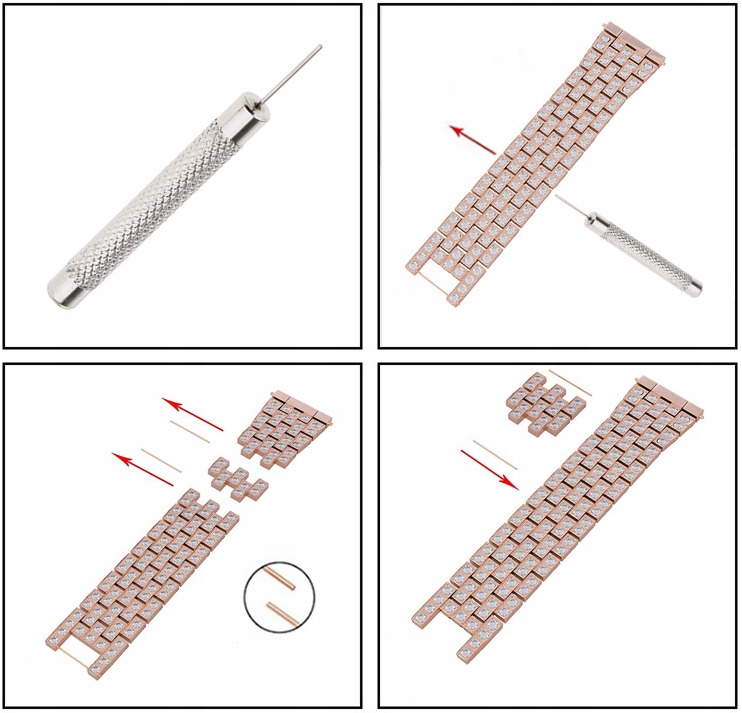 К каждому браслету прилагается пуансон (устройство для регулировки длины браслета). Работа устройства очень проста, показана на фото ниже.