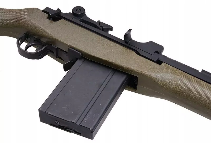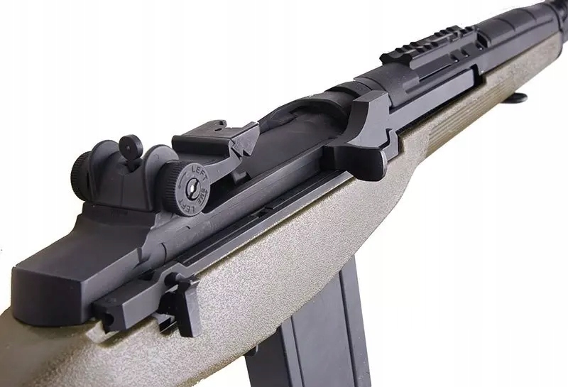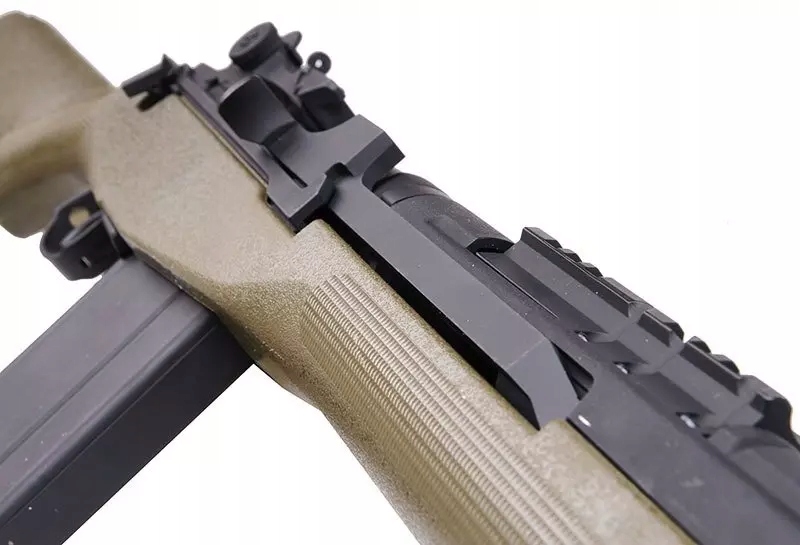 Реплика оснащена верхней монтажной планкой RIS шириной 22 мм, которая позволяет крепить все виды оптических прицелов. CM032A имеет удобный предохранитель, расположенный рядом со спусковой скобой, переключатель режимов огня, управляемый большим пальцем, и набор регулируемых механических прицелов. Батарея расположена внутри фиксированного приклада реплики.