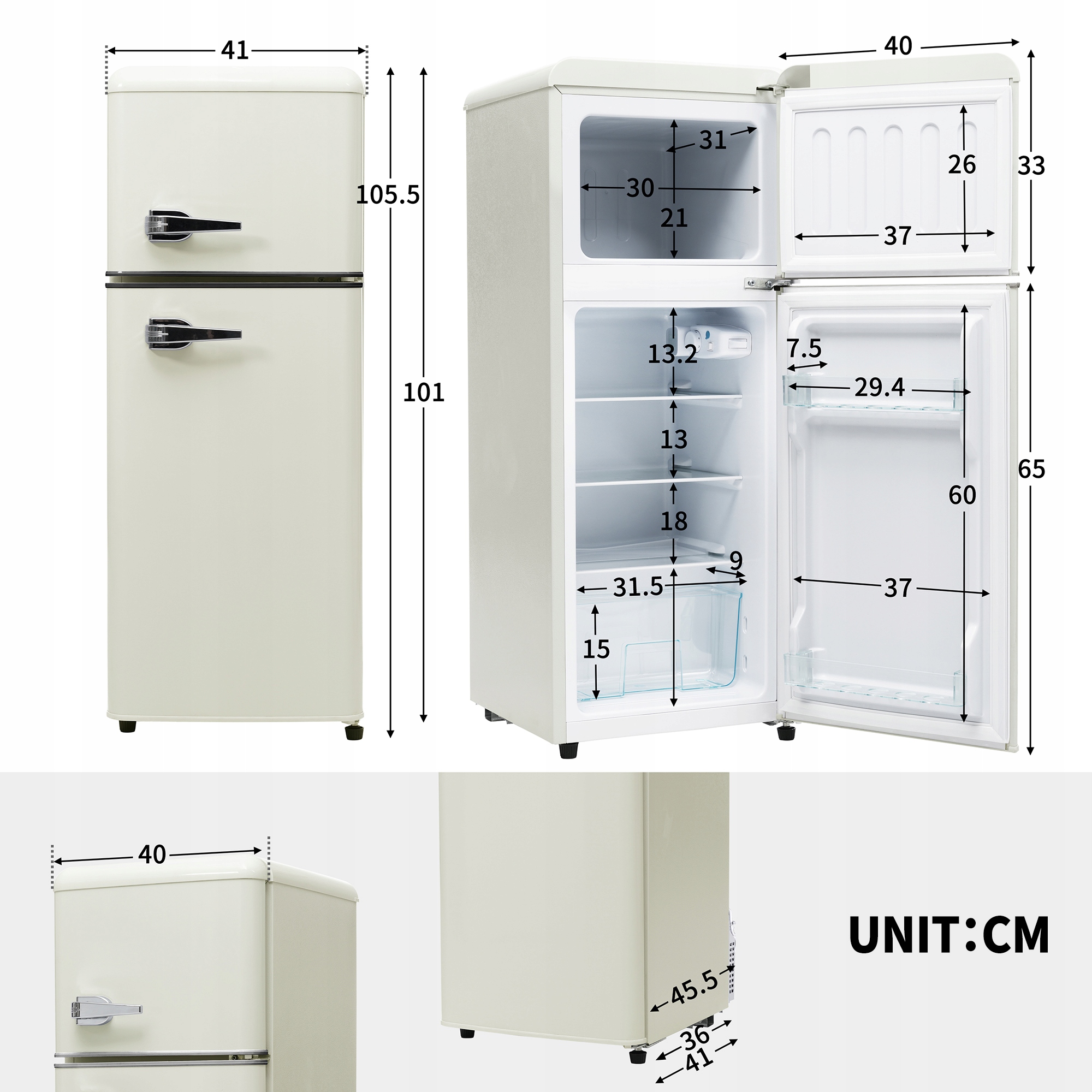 Ретро холодильник. Холодильник с морозильной камерой, высота 105,5 см, ширина 41 см, два -1, с общей емкостью 92 литров, морозильная емкость 28 литров. Полки на дверях и стеклянные полки. 116 кВтч/год, -27 ° C ~ 13 ° C, светодиодный свет