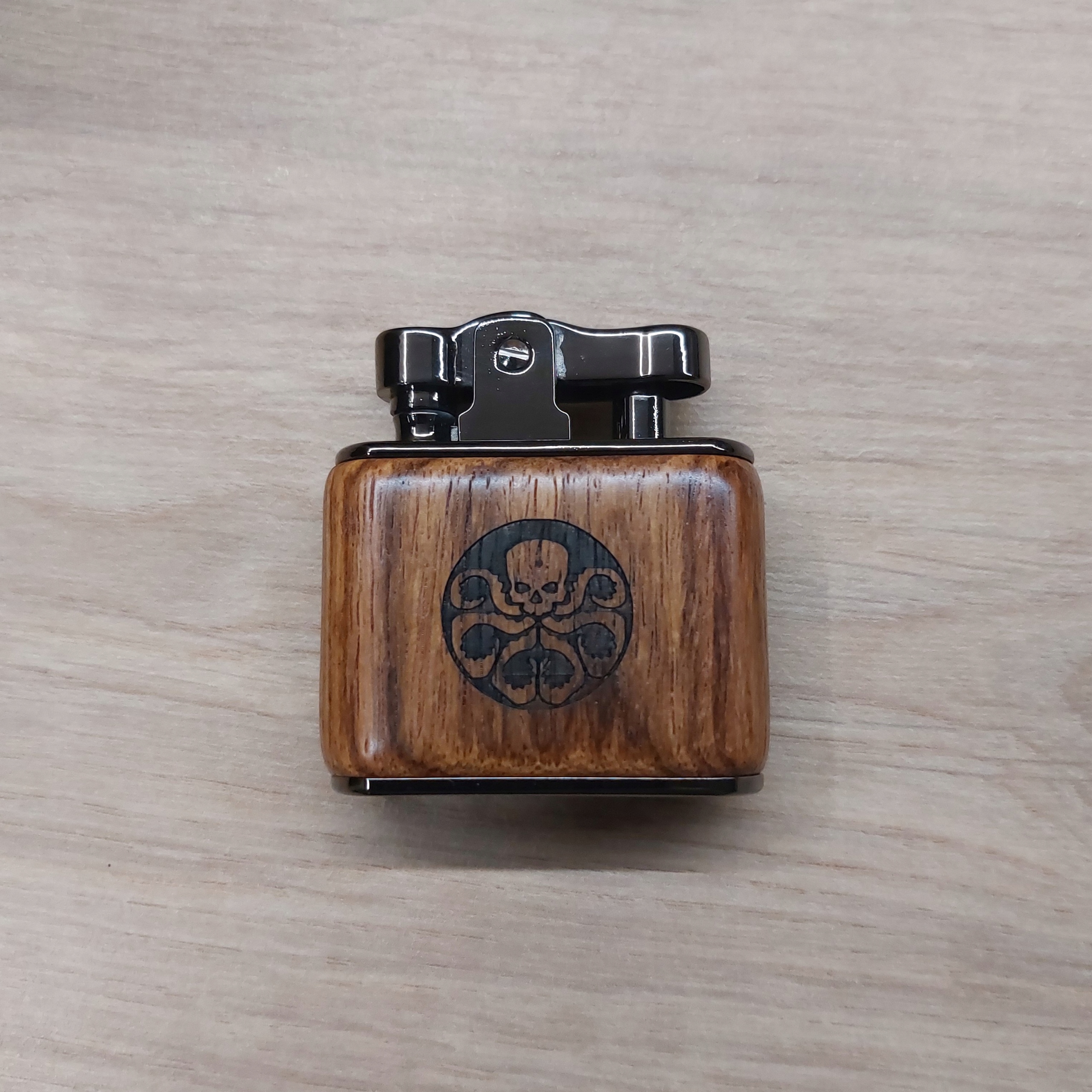 Абсолютно уникальный, элегантный retro -стиль бензин легче с красивым пальто из драгоценного дерева красного дерева, с лазерным мотивом осьминога на деревянной поверхности.