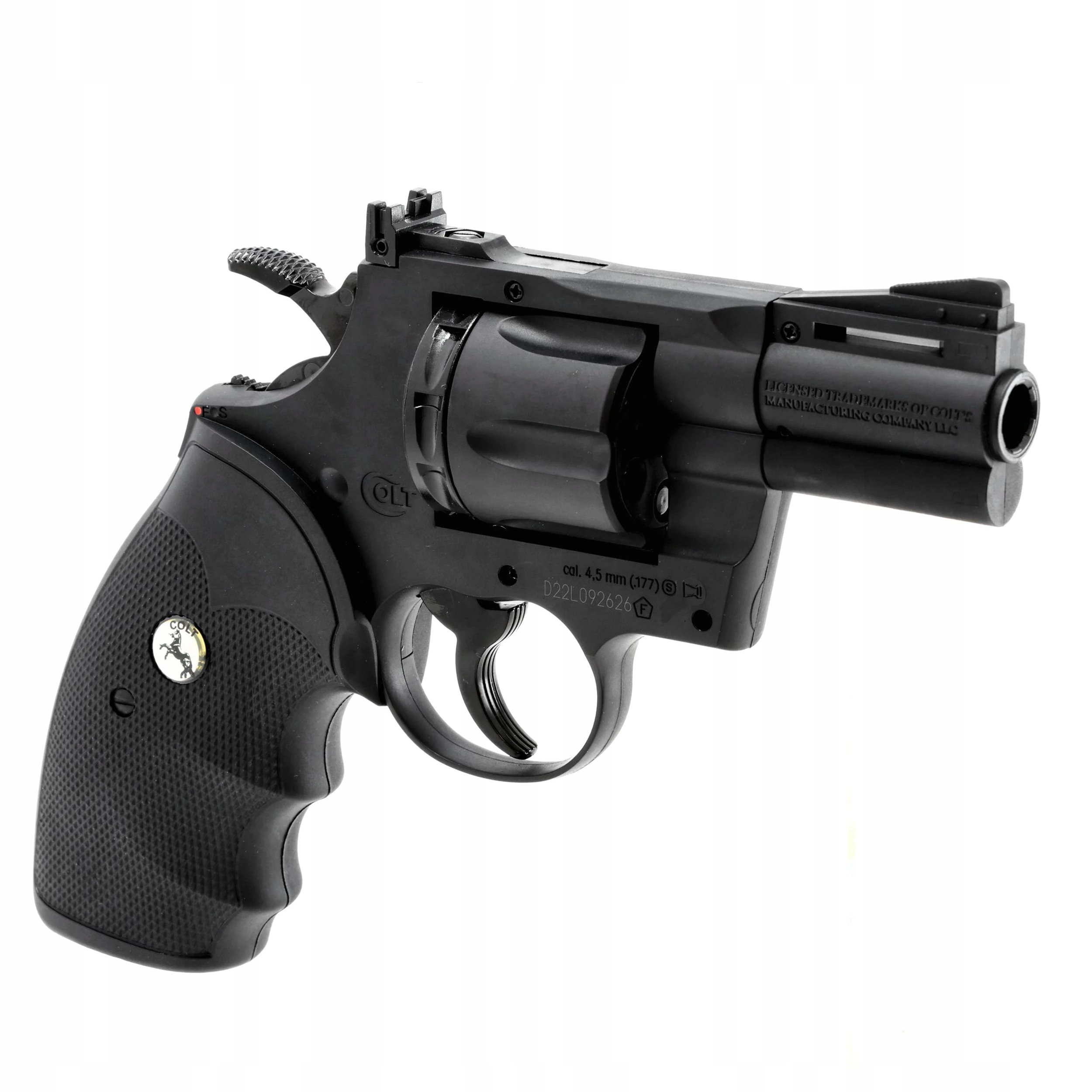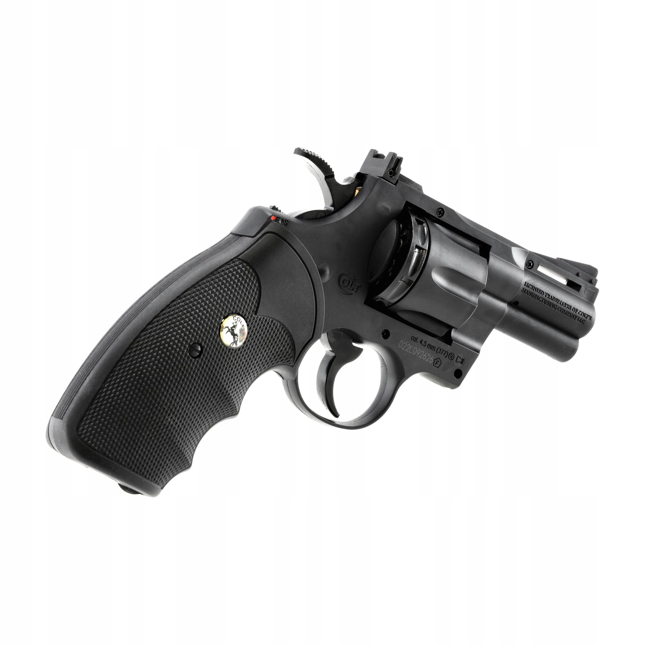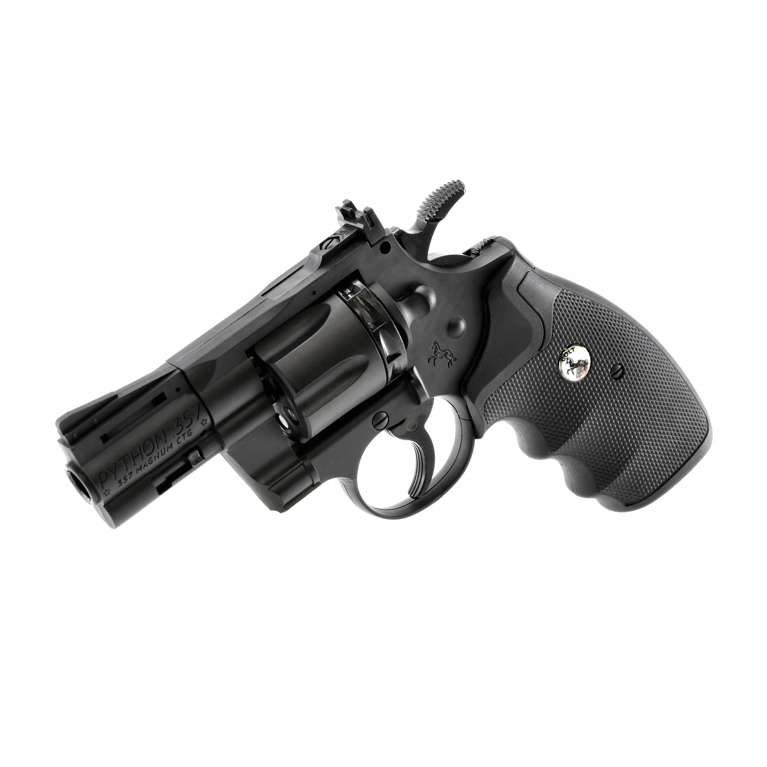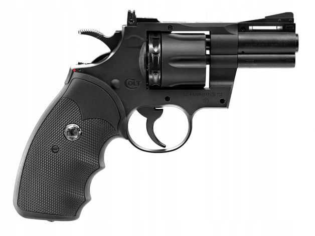 colt python 2,5 "4,5 мм Bb co2 - пневматическая копия культового револьвера Magnum .357, приводимой в систему с капсулой CO2 и Съемки Diabolo и BB . У Revolver состоит конструкция, сделанная в основном из полимера. Револьверная ручка - это прорезитованная оболочка с помощью анатомических пальцев