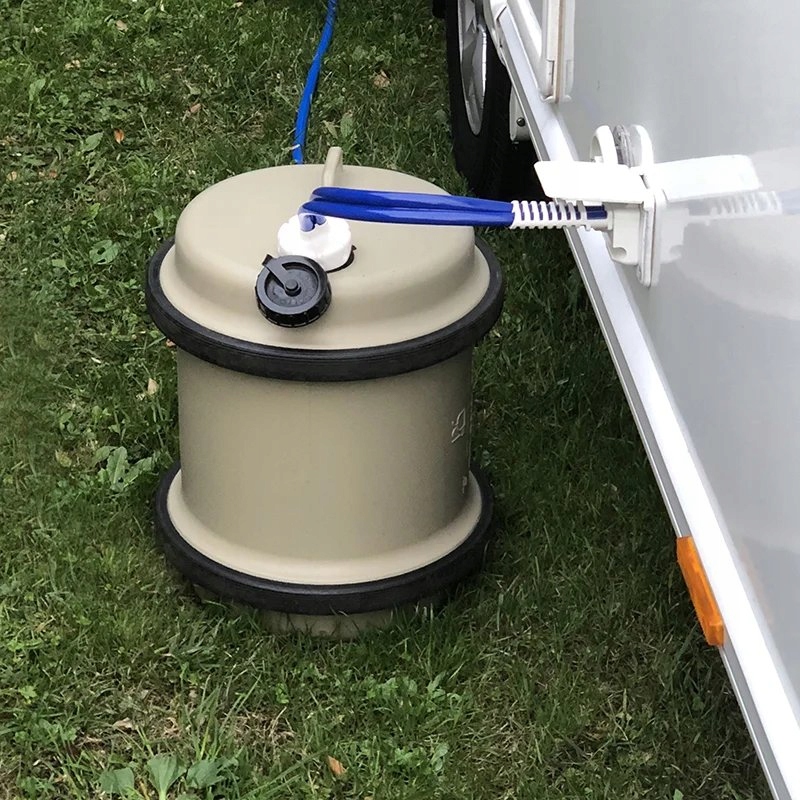 Отличается прочностью и удобством в использовании. Оснащен двумя шинами, облегчающими транспортировку воды на территории кемпинга, и прочной ручкой для переноски. В комплект также входит шланг для наполнения бака.