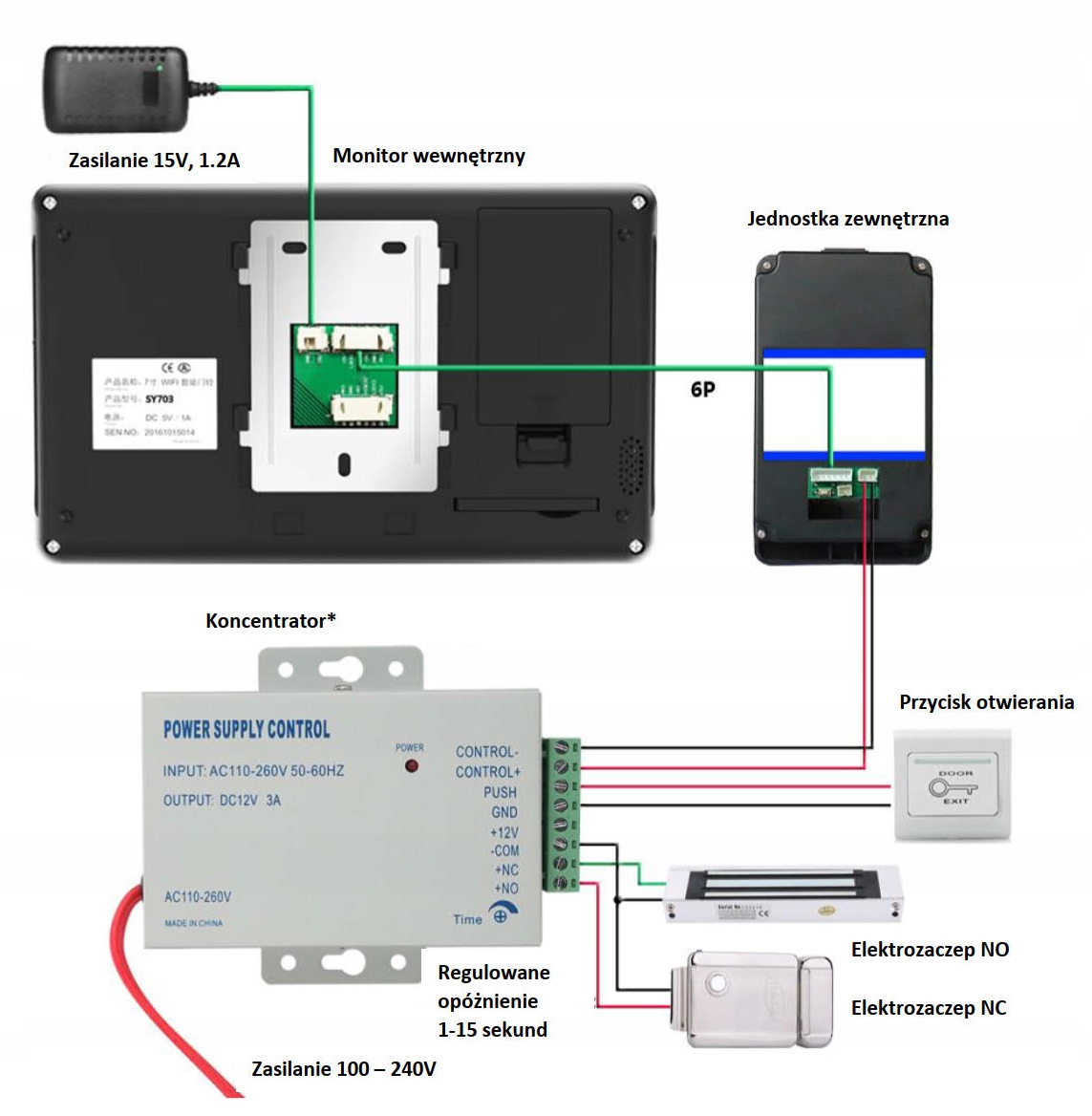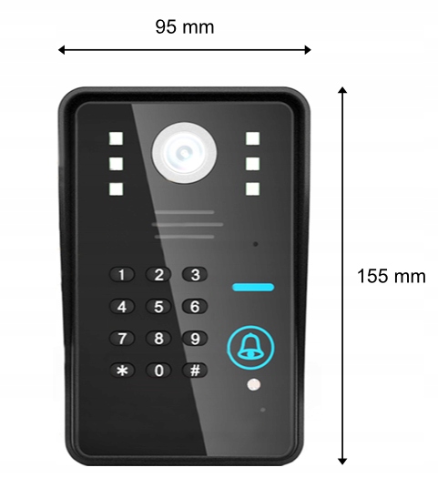 - Энергопотребление: панель — режим ожидания 3 Вт, подключение 8 Вт; внешний блок — режим ожидания 2 Вт, открытие 12 Вт