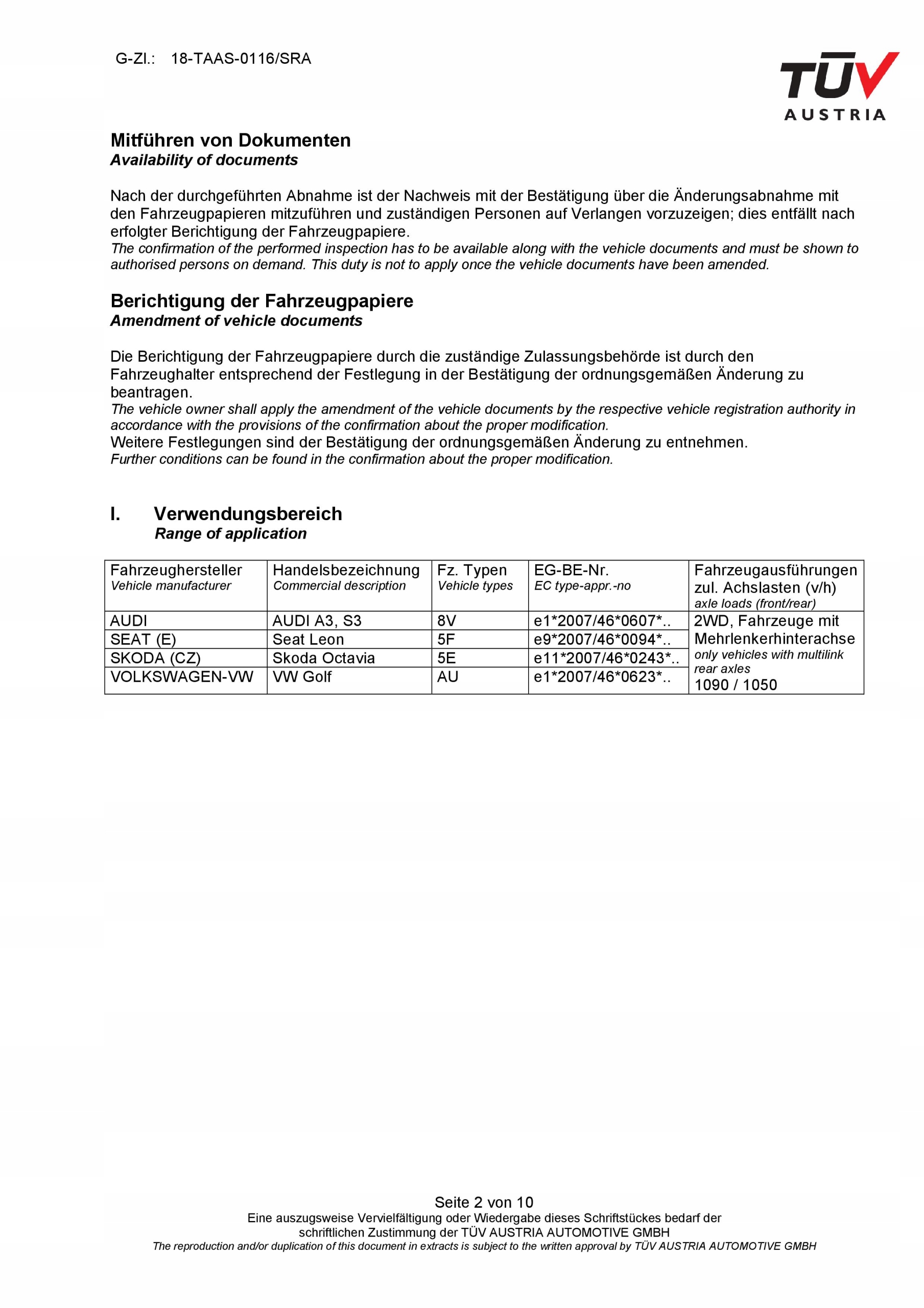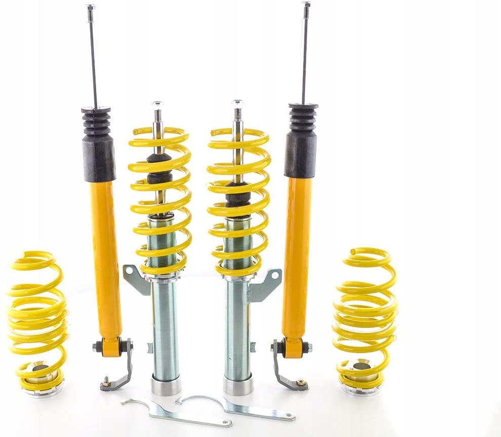 В комплект входят 2 резьбовых амортизатора, 4 спортивные пружины, задние амортизаторы, задние регулировочные втулки, ключ для регулировки высоты, сертификат TUV и гарантия 24 месяца.