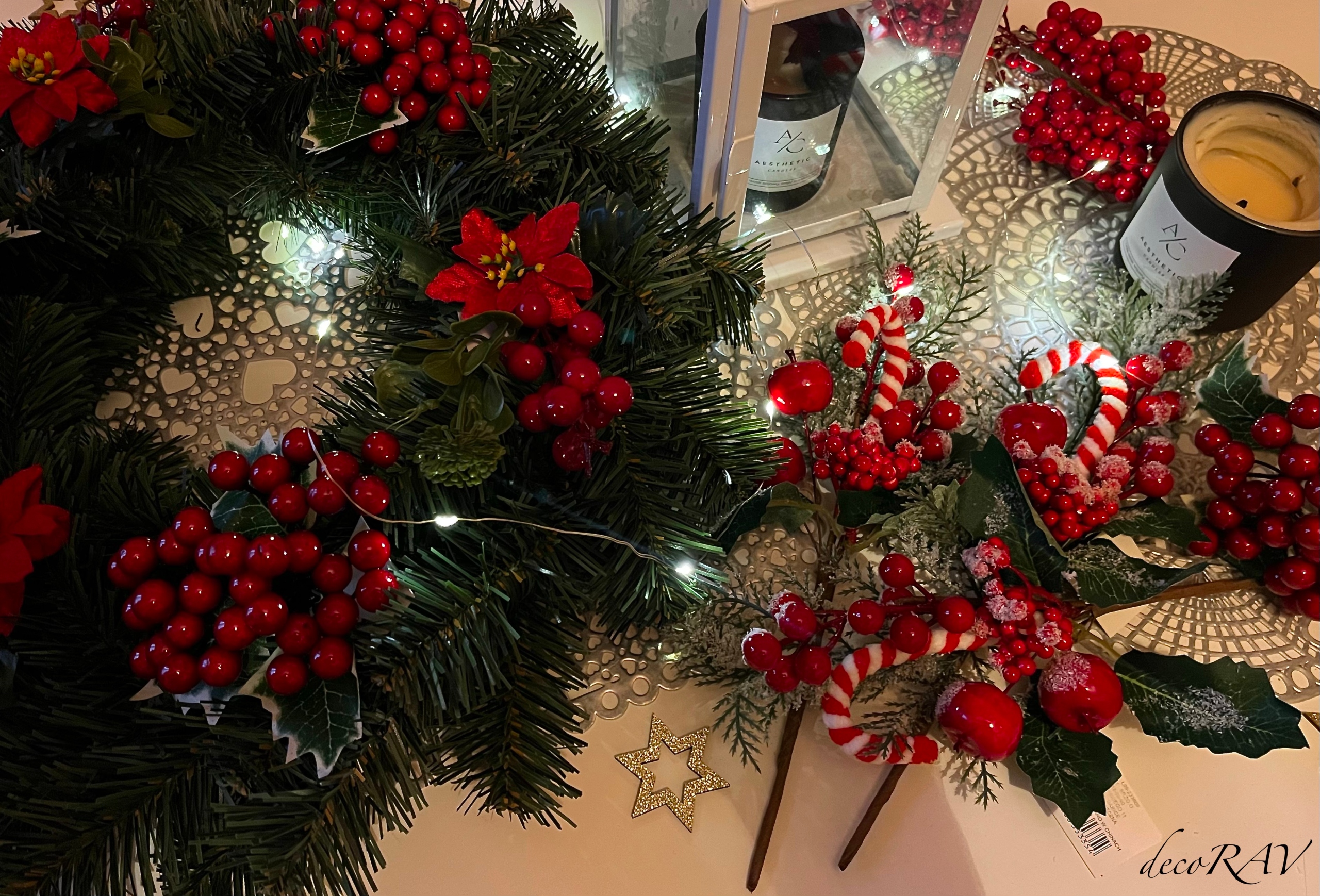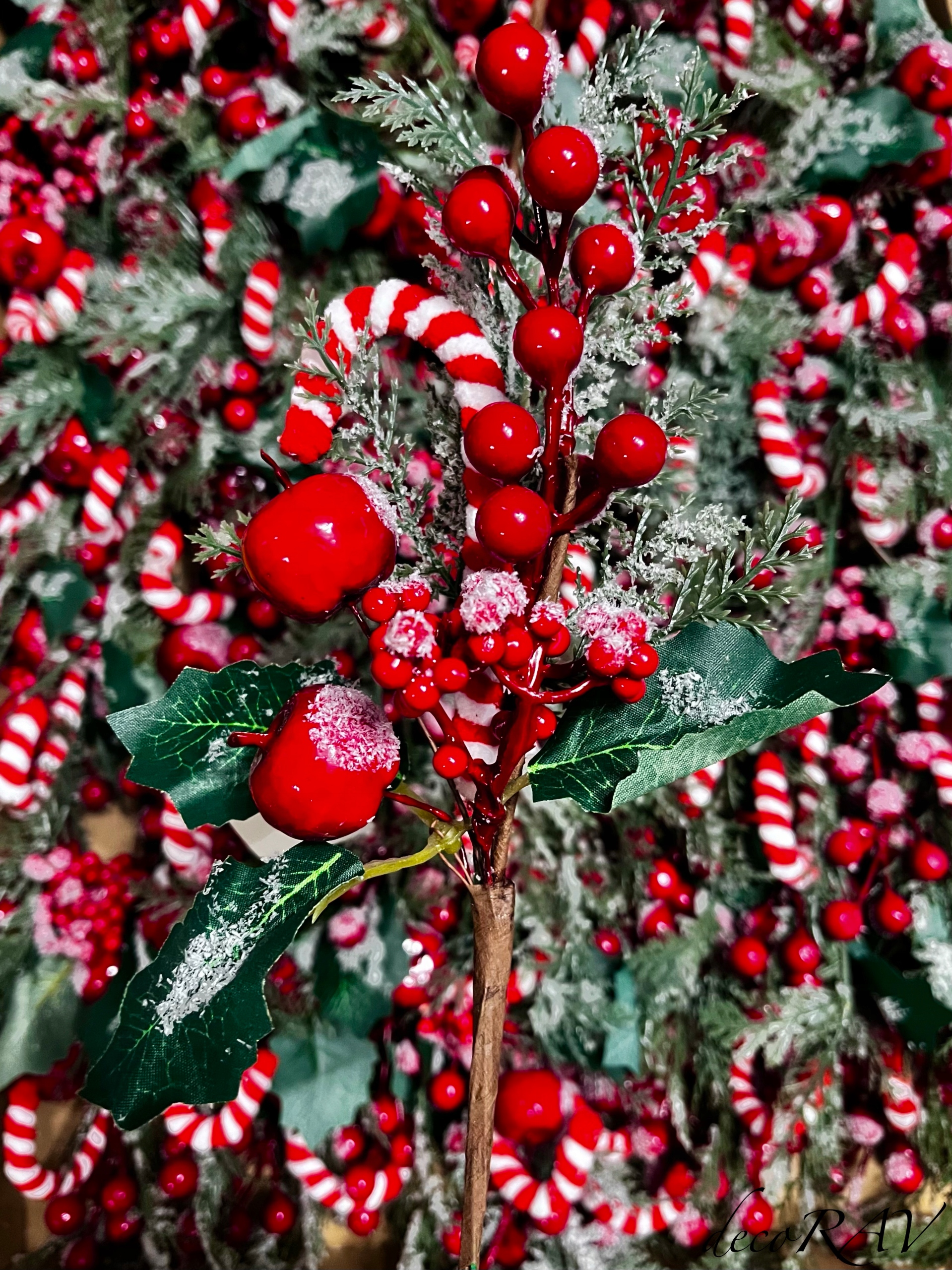 Рождественская декоративная ветка 30 см - Яблоки, боярышник, леденец, искусственный снег