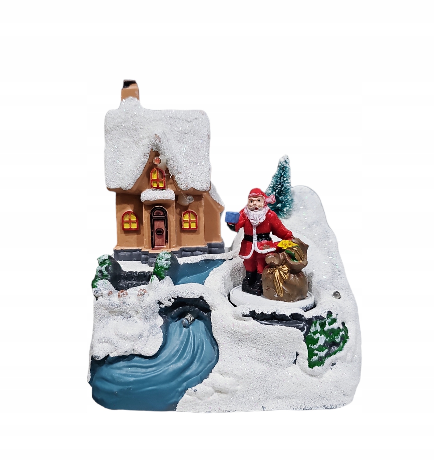 Рождественская сцена с домиком, елкой, вращающимся Дедом Морозом с мешком с подарками, блестками, светодиодной подсветкой.