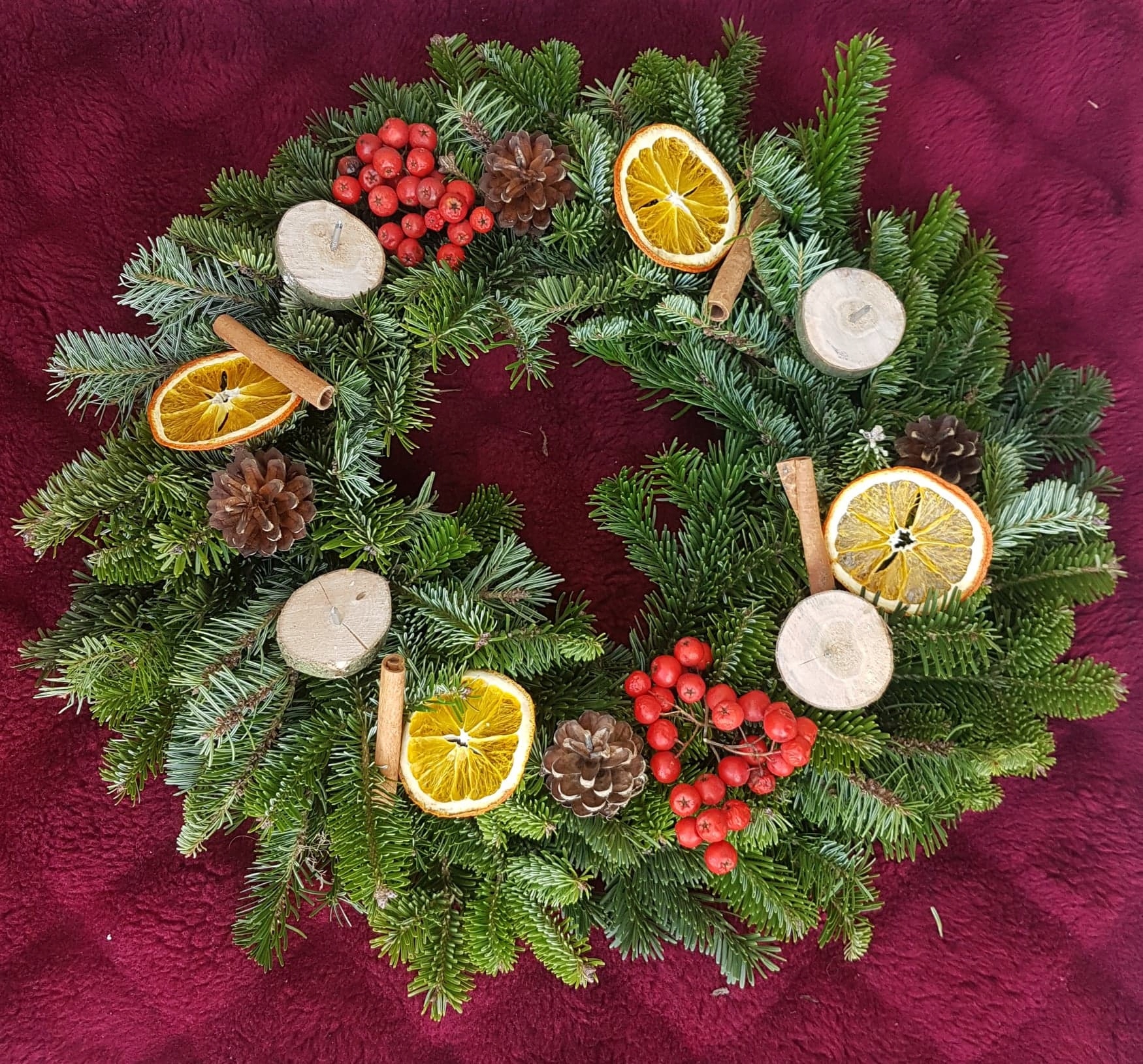 Венок выполнен из живых еловых веток, украшен: сушеным апельсином, > плоды шиповника, ароматизированные палочками корицы и маленькими сосновыми шишками. Дополнительно имеются деревянные подсвечники.