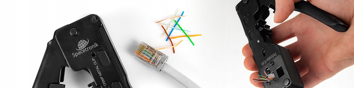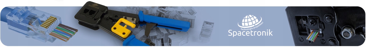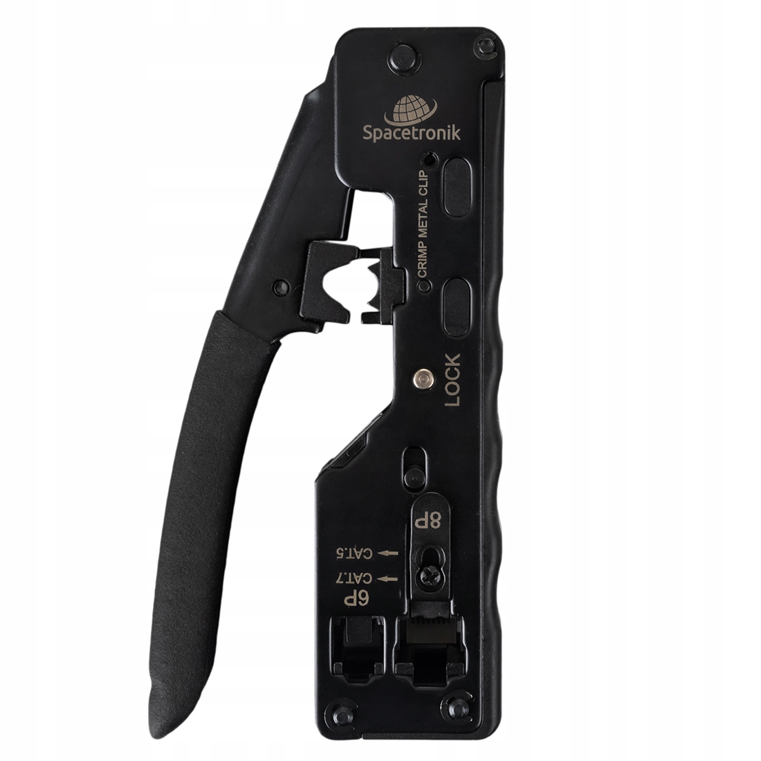 Инструмент, предназначенный для зажима RJ45 8p8c (как через, так и стандартный) и стандартный RJ11 (6p4c), RJ12 (6p6c). Кроме того, в инструмент был встроен затяжка экрана. Специальное механизм давления предотвращает недостаточное количество разъемов. SpaceTronik PT-CT02 имеет блокировку, которая предотвращает нежелательное открытие инструмента. Рабочие элементы изготовлены из металлического литья, ручка, окруженная пластиковой крышкой, обеспечивается определенным инструментом во время работы.