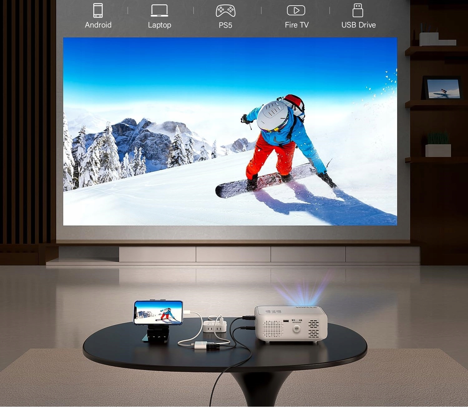 Сочетание многих устройств, которые небольшой проектор подходит для игры в фильмы, телевизионные сериалы, обмен фотографиями, футбольными играми и т. Д. Его можно легко подключить к ноутбукам, телефонам, планшетам, USB и PS5, чтобы сделать развлечения более захватывающими. Если вы позвоните по телефону, вы должны купить дополнительный адаптер HDMI. Из -за авторского права Netflix, Prime Video, Hulu и т. Д., Они могут играть только телевизионную палку, год и т. Д.