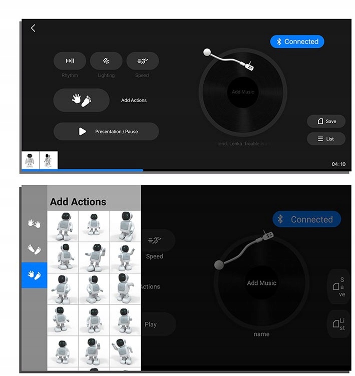 Благодаря интеллектуальному алгоритму робот Dance Robert будет произвольно танцевать в ритме и темпе воспроизводимой музыки. Просто вставьте карту памяти microSD с аудиофайлами или воспроизведите музыку с мобильного устройства через беспроводной интерфейс Bluetooth