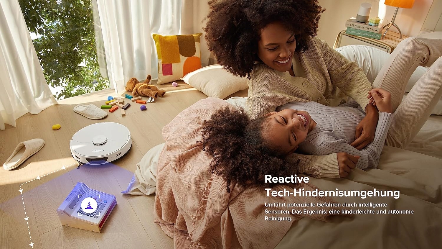 Обход препятствий. Домашний пол представляет собой полосу препятствий, усеянную носками, игрушками, чашками и многим другим. 3D-сканирование со структурированным светом точно определяет расположение и размер препятствий и опасностей как в светлых, так и в темных помещениях, обеспечивая беспроблемную уборку в любое время.