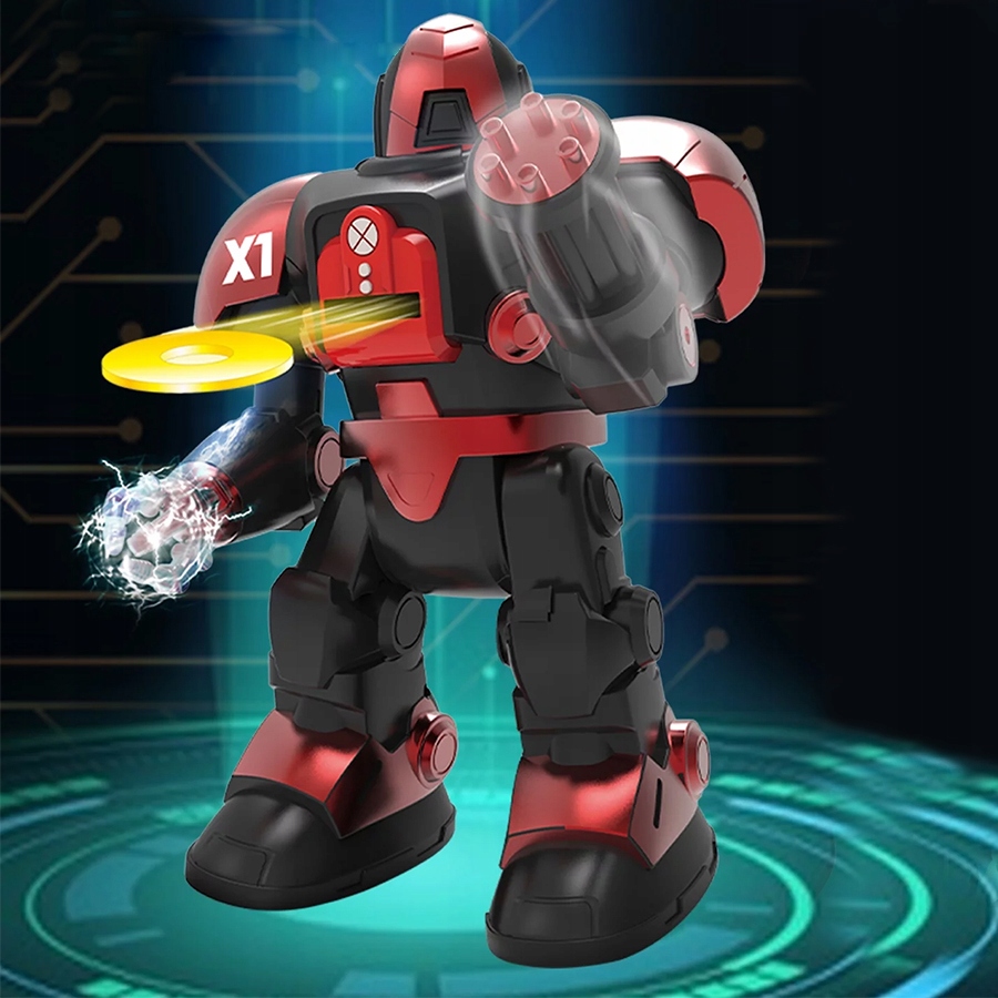 Интерактивный робот обладает множеством удивительных функций, таких как ходьба, поворот, танец и стрельба пенопластовыми дисками. Играть со стреляющим роботом совершенно безопасно, диски мягкие, из пенопласта, в комплекте идет весь комплект! Во время игры вы можете устраивать мини-соревнования по стрельбе по определенной мишени.