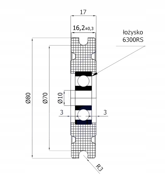 РОЛИК фи.80мм ДЛЯ ВЕРЕВКИ 6мм, ПЛАСТМАССОВЫЙ С ПОДШИПНИКОМ