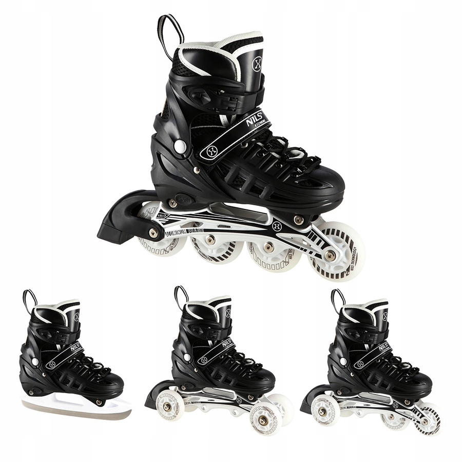 NH10905 Set Nils Extreme — коньки, созданные для любителей катания на коньках. Продукт предлагает 4 варианта конфигурации. Это: коньки, роликовые коньки, роликовые коньки и роликовые коньки. Роликовые коньки производят неповторимое впечатление благодаря светящимся светодиодным колесам.