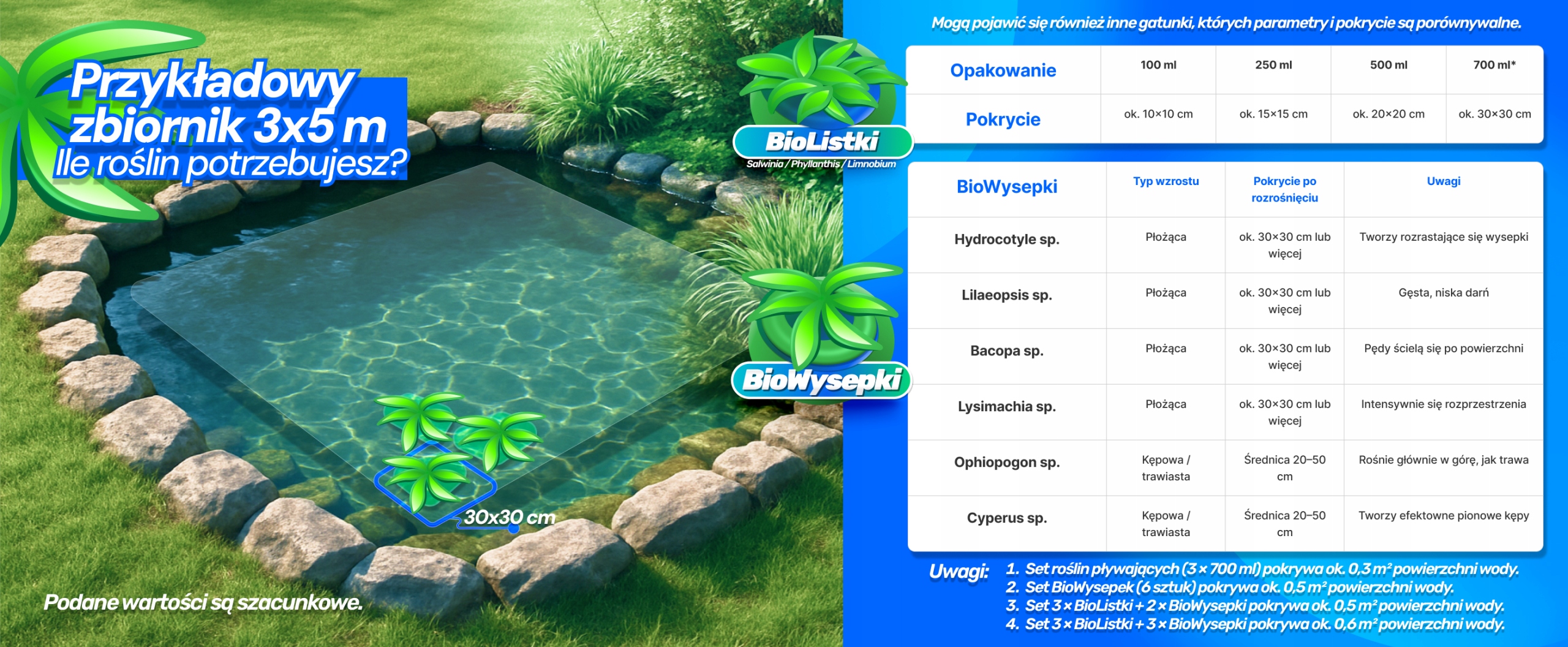 Мы представляем полный набор плавучих растений и биовиссов, который представляет собой современную, правовую и экологическую альтернативу растениям, запрещенным в ЕС, таких как водные гиацинт (Eichornia Crassipes) и Пьстья (псельтиотическая писти). Из -за их обширного характера эти растения были отозваны из продаж в Европейском Союзе. Наш набор - это ответ на это изменение - он объединяет эстетические значения, функциональность и соответствие правилам.