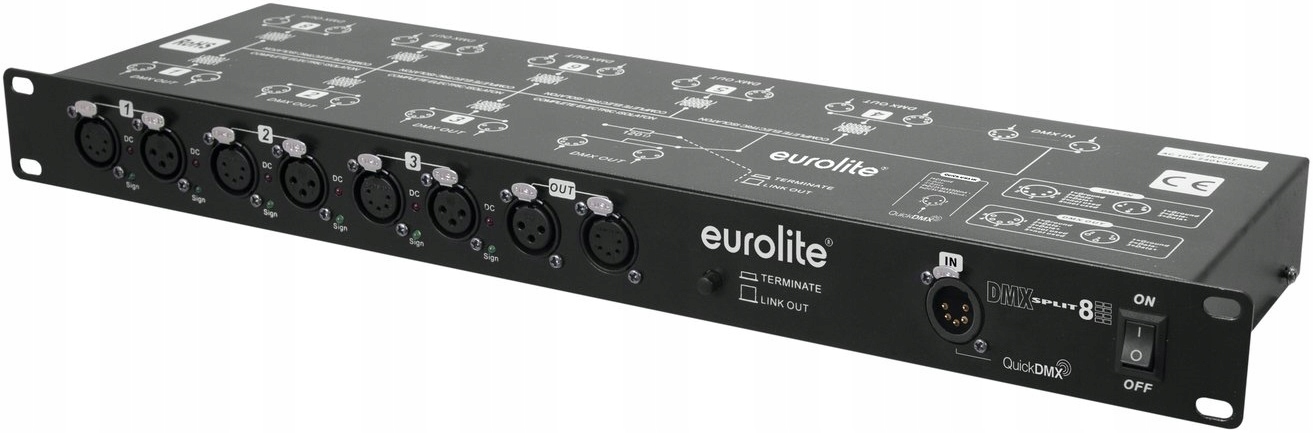 - 1 вход DMX, 1 проходной выход DMX, 8 выходов DMX