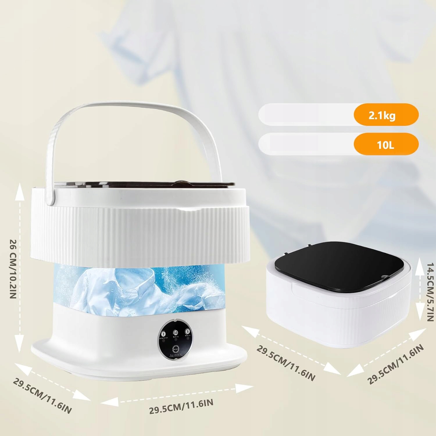 Небольшая портативная стиральная машина ловко принимает складная конструкция имеет размеры 11,6 x 11,6 x 10,2 дюйма в разложенном виде и 11,6 x 11,6 x 5,7 дюйма в сложенном виде. Корпус весит всего 4,6 фунта. Он компактен и удобен для переноски, идеально подходит для квартиры, общежития, отеля или путешествия.