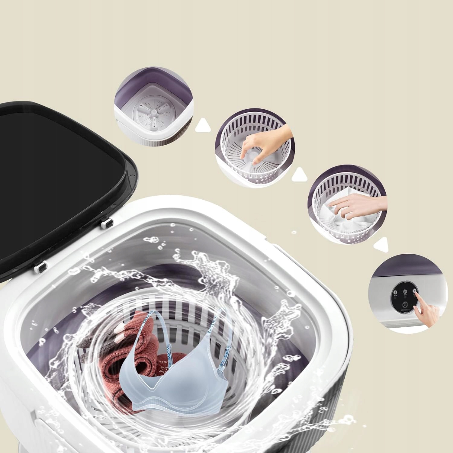Эта портативная стиральная машина оснащена функциями стирки и опорожнения, она небольшого размера, но имеет те же функции, что и большая стиральная машина. Наша мини-стиральная машина предназначена для деликатных и мелких вещей, очистка крупных вещей может привести к повреждению стиральной машины. Вы можете одновременно стирать 1 детское банное полотенце, 6 нижнего белья, 8 детских вещей и 12 носков.