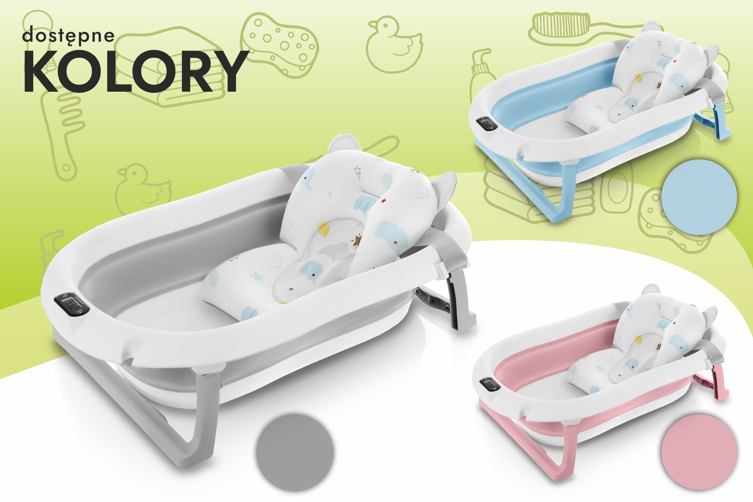 Ванна была разработана для ежедневного комфорта родителей. Благодаря складному дизайну вы можете легко хранить его в гардеробе или взять с собой в путешествие. Встроенный термометр позволяет отслеживать температуру воды, что гарантирует, что ребенок будет купаться в удобных условиях (прежде чем положить ребенка в воду, всегда убедитесь, что его температура верна!). Дополнительная подушка, установленная на ремнях, позволяет ванне новорожденных, стабилизируя ее положение