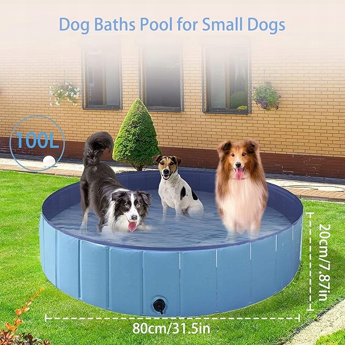 - Бассейн для собак составляет 80 см х 20 см в диаметре (диаметр 31,5 дюйма x 7,87 дюйма высотой). Емкость: 100 литров. Ванная комната для собак подходит для животных весом ниже 110 кг. Высота воды не должна превышать 80% площади бассейна. ПРИМЕЧАНИЕ. Чтобы обеспечить длительное использование, вырежьте когти собаки перед каждым использованием.