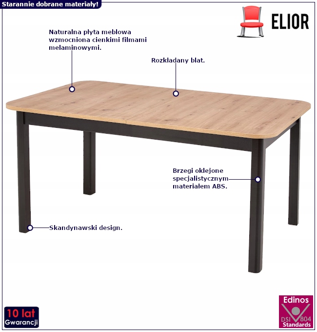 В чем секрет долговечности и неизменного качества продукции Dibella? Это, безусловно, квалифицированные дизайнеры Elior, которые тщательно отбирают каждый материал, используемый в производстве мебели. Стол изготовлен из натурального мебельного щита, изготовленного из древесных волокон и органических соединений в условиях высокого давления и температуры. Волокна расположены в разных направлениях, имеют синусоидальную структуру, что обеспечивает ее качество и долговечность. Кроме того, доска покрыта тонкими меламиновыми пленками для повышения ее долговечности. Края мебели покрыты специальным материалом ABS, характеризующимся устойчивостью к царапинам выше среднего. Более того, благодаря такой обработке Дибелла выглядит исключительно эстетично.