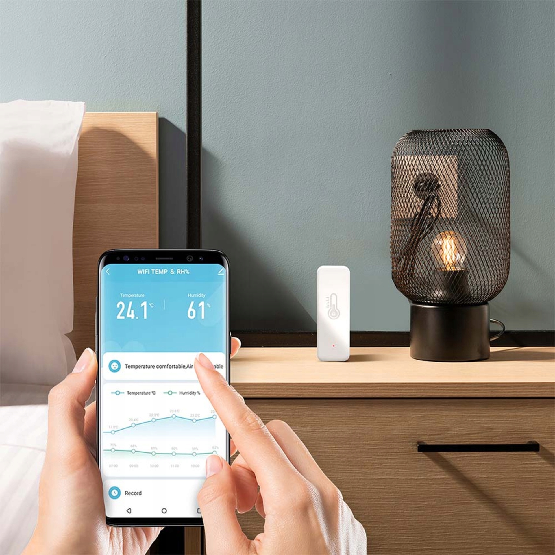 Интеллектуальный датчик температуры и влажности Wi-Fi, приложение Smart Life/Tuya, возможность подключения к другим интеллектуальным устройствам и настройкам условий, у вас есть онлайн-обзор температуры и влажности, запись температуры и влажности на четком графике, возможность настройки сигнализация по температуре и влажности, датчик подключается к сети WiFi самостоятельно без каких-либо дополнительных устройств, диапазон измерения светодиодного индикатора: -20 + 60°С, влажность 0-99,9%, точность измерения: ±0,6°С; влажность ±6% Информация о состоянии батареи, предупреждение о низком заряде батареи Wi-Fi 802.11b/g/n 2,4 ГГц Источник питания 3 В постоянного тока (2 батарейки типа ААА) Упаковка: 2 батарейки, монтажная лента, руководство только для внутреннего использования